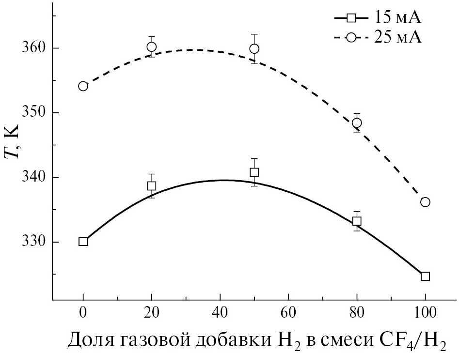 Как показали эксперименты, увеличение доли водорода при постоянстве силы тока приводит к уменьшению осевой напряженности электрического поля (табл. 1): в 1.7 раза для i = 15 мА и в 2 раза для i = 25 мА при росте доли водорода 0—100%. Падение осевой напряженности электрического поля также сопровождается монотонным уменьшением удельной мощности (рис. 1), вкладываемой в плазму CF4/H2. Также было установлено, что величина температуры газа (рис. 2) проходит через максимум при отметке 50% водорода в смеси, далее уменьшается до значений температуры соответствующей плазме чистого водорода (в диапазоне 0—50% водорода в смеси CF4/H2: при i = 15 мА температура увеличивалась от 330 до 340 К при i = 25 мА с 354 по 359 К, в 1.03 и 1.01 раза соответственно, а при 100% H2 в смеси температура уменьшалась до 323 и 336 К для i = 15 и 25 мА соответственно). Объяснением такого хода полученных зависимостей температуры газа с увеличением доли водорода в смеси, по нашему мнению, может являться рост коэффициента теплопроводности газа (увеличение параметра ηгаз в 10 раз при росте доли водорода 0—100% для обоих токов разряда).