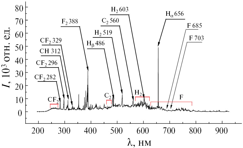 На рис. 4 приведен обзорный спектр излучения плазмы смеси тетрафторметана с водородом. Из данного спектра видно, что излучение представлено атомарными и молекулярными компонентами. В спектрах излучения CF4 с H2 были обнаружены линии атомарного фтора в диапазоне 620—820 нм (самыми интенсивные — 685 и 703 нм). Также в спектрах были обнаружены три интенсивные линии атомарного водорода серии Бальмера: Hα (656 нм), Hβ (486 нм), Hγ (434 нм). Излучение атомарного углерода зафиксировано не было. Излучение молекулярных компонентов представлено системой полос CF в интервале от 200—230 нм, CF2 — в интервале 240—330 нм (интенсивными являются 262, 296 и 329 нм), F2 — 388 нм, CH —312 нм. Излучение молекул углерода представлено системами полос Свана (468, 471, 560 нм). Спектр излучения молекулярного водорода представлен полосами α-системы Фулхера (575—625 нм) и интенсивными полосами водорода с длинами волн 483 и 519 нм.