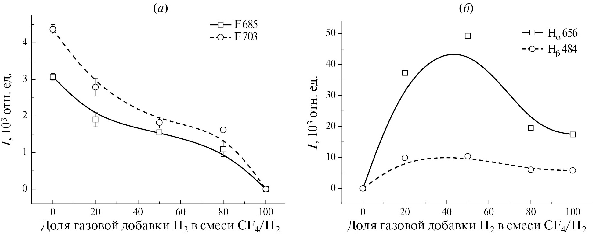 Для выбранных атомарных линий (рис. 5) и молекулярных полос (рис. 6) были получены зависимости интенсивности излучения от доли водорода в смеси CF4/H2. Из приведенных зависимостей (см. рис. 5) видно, что интенсивности излучения атомарных линий фтора с увеличением доли водорода в смеси CF4/H2 плавно уменьшаются (рис. 5, а), в то время как интенсивности излучения атомов водорода проходят через максимум и при доле водорода в смеси 80% выходят на стационарные значения (рис. 5, б). Из зависимостей рис. 6 видно, что происходит монотонное уменьшение интенсивности излучения молекулярного фтора, в то время как интенсивность увеличивается радикала CF2 достигает максимальных значений при 20% доли водорода в смеси тетрафторметаном. Интенсивность излучение молекулы H2 увеличивается (до 50% доли H2) и выходит на стационарные значения при высоких долях H2 в смеси CF4/H2.