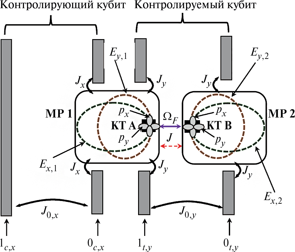 Рис. 1. Схема квантового узла, который реализует двухкубитную операцию CNOT на фотонных кубитах. Контролирующий (контролируемый) кубит представлен двумя волноводами, каждый из которых поддерживает одну моду с x(y) поляризацией. Их энергии взаимодействия J0, x(y) предполагаются малыми. Квантовые точки КТ А и КТ В расположены в пучностях мод Ex(y),1 и Ex(y),2 микрорезонаторов МР 1 и МР 2. Оба МР обмениваются фотонами друг с другом, волноводами контролируемого кубита и волноводом контролирующего кубита со скоростями J, Jy и Jx, соответственно. Электронные переходы между состояниями g и px(y) в каждой из КТ косвенно связаны с соответствующими модами волноводов через МР. Прямой обмен энергией между КТ происходит под влиянием взаимодействия Ферстера со скоростью ΩF