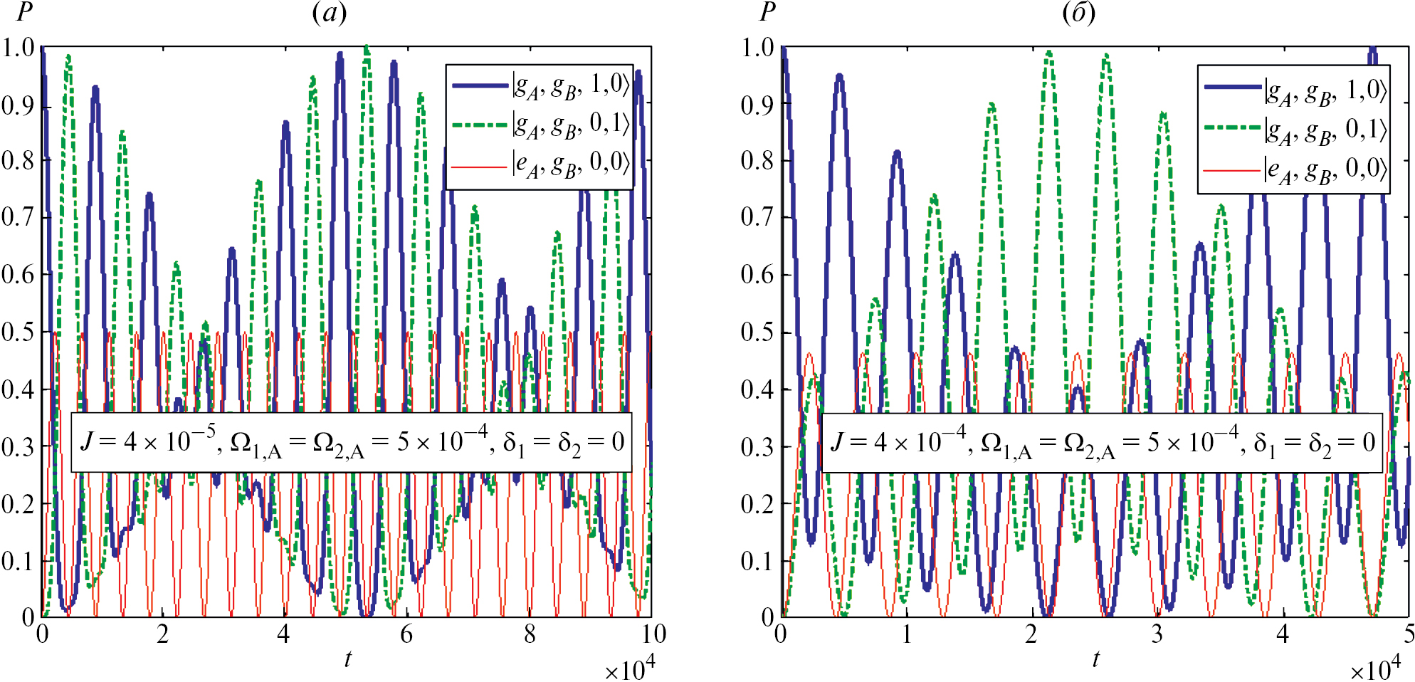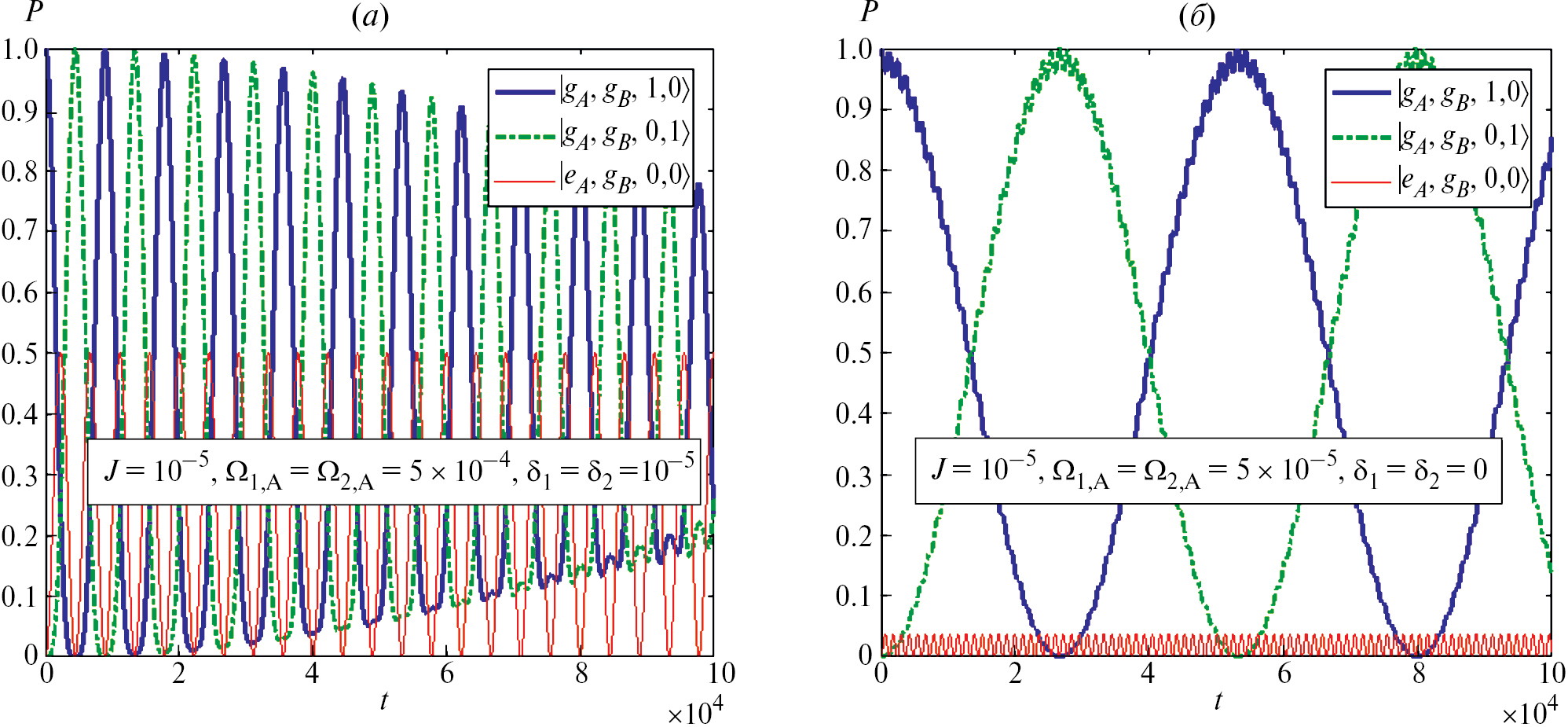 Рис. 2. Графики зависимостей заселенностей базисных состояний от времени для схемы непрямого переноса фотона между волноводами контролируемого кубита через КТ А. Учитывается нежелательный эффект прямого фотонного туннелирования с малыми (а) и промежуточными (б) скоростями J. Все параметры даны в единицах частоты оптического перехода в КТ