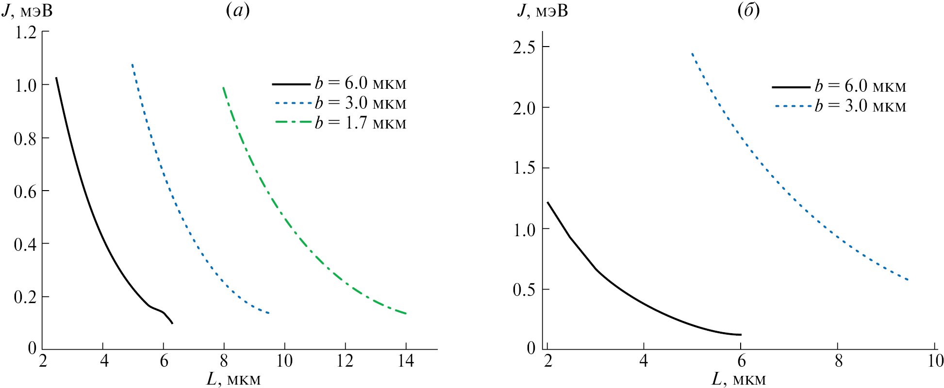 Рис. 6. Графики зависимостей коэффициента J оптического взаимодействия двух волноводов толщиной h = 1.77 мкм от расстояния L между ними при различных значениях ширины b для x-моды (а) и y-моды (б)