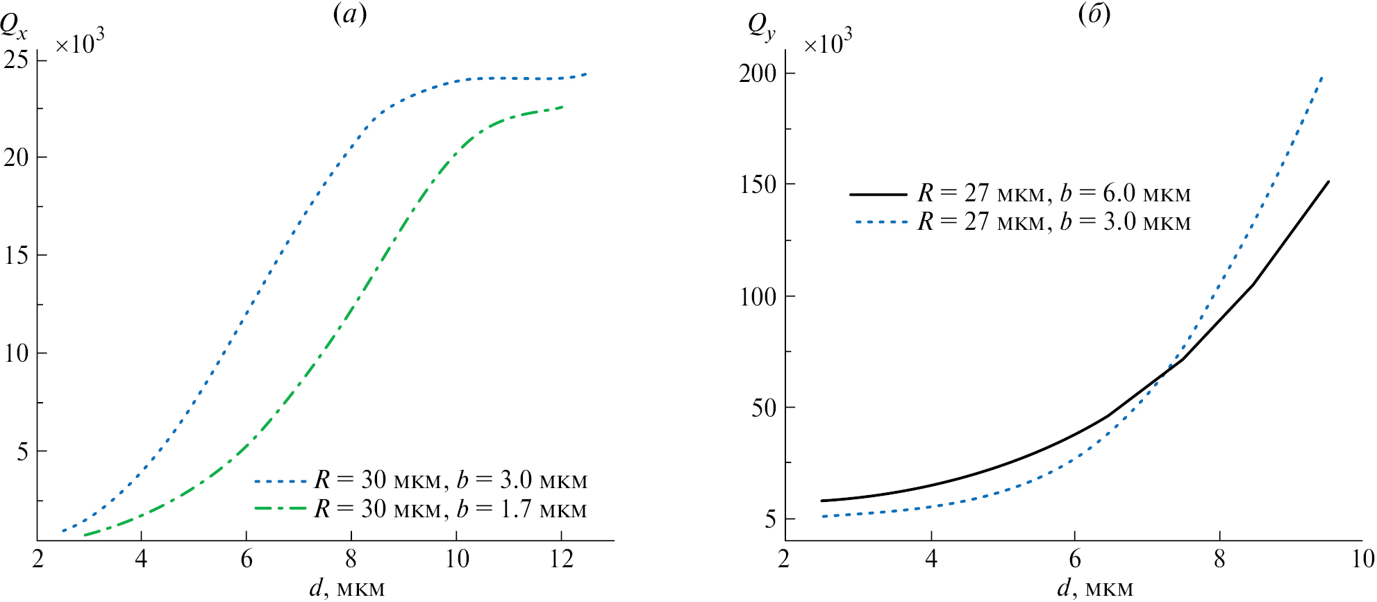 Радиус R, мкм | Толщина h, мкм | Длина волны ТМ-моды λx, мкм | Излучательная добротность ТМ-моды Qx | Длина волны ТЕ-моды λу, мкм | Излучательная добротность ТE-моды Qy |