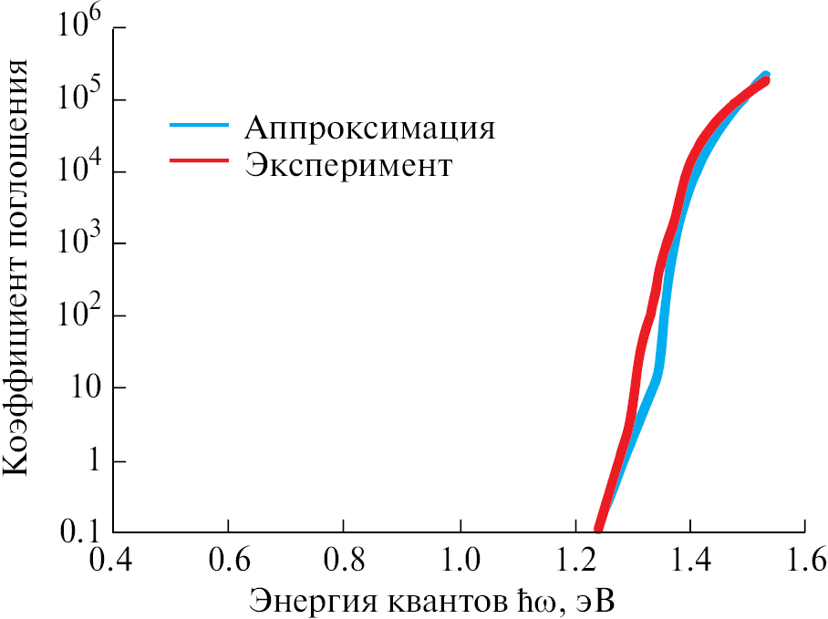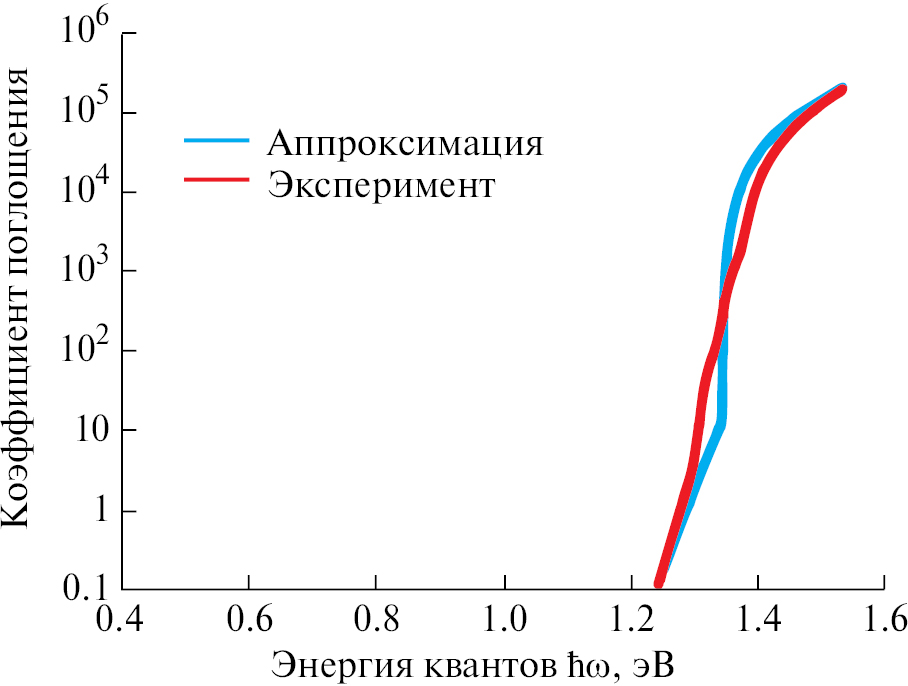 Неплохие результаты дает также предположение о наличии еще одной полосы поглощения около 1.25 эВ. Можно предположить, что здесь происходит слабое, но быстрорастущее поглощение за счет, например, переходов электронов из валентной зоны на мелкие примесные донорные уровни, или же вероятен более сложный механизм поглощения с участием глубоких уровней. В этом случае, будем отталкиваться от 3-х линий поглощения: 1.25; 1.3 и 1.36 эВ, тогда (см. рис. 7):