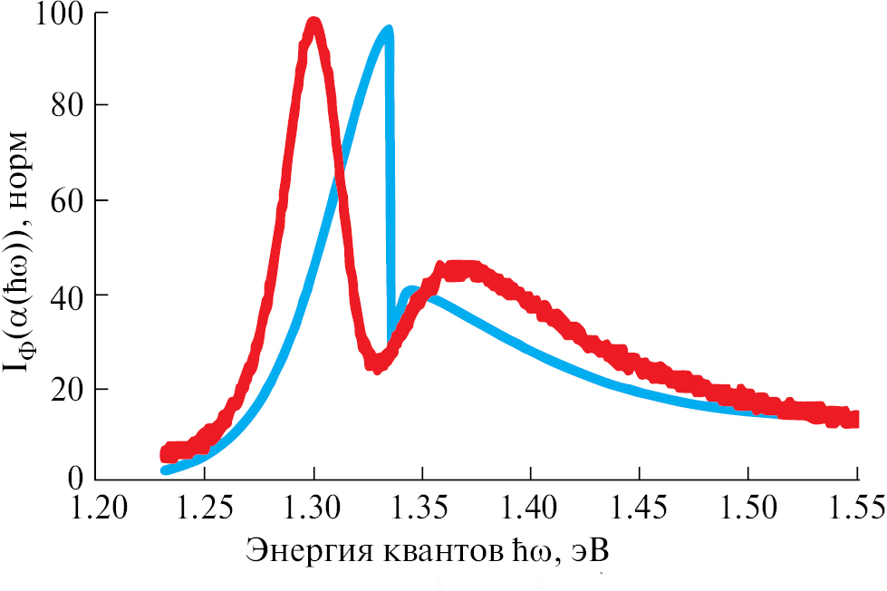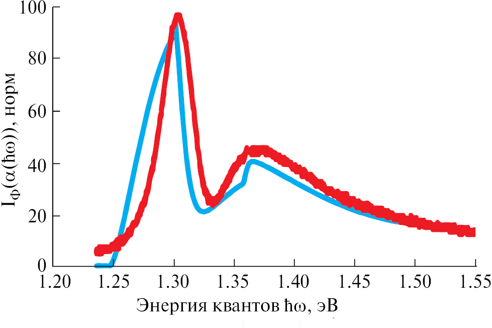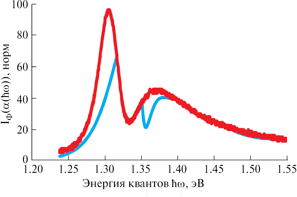 Таким образом, для аппроксимации целесообразно использовать еще один член, зависящий от Eg = 1,30 эВ. Иными словами, будем рассуждать, что в “активированном (очувствленном) состоянии” образец сочетает свойства сразу двух материалов с ширинами запрещенных энергий 1,30 эВ и 1,34 эВ. Тогда зависимость примет следующий вид (см. рис. 6):