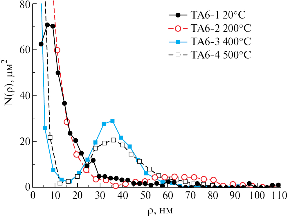 На рис. 2 представлены латеральные распределения N(ρ) островков по радиусам ρ эквивалентных площадей в виде круга. Кривые распределения получены с помощью программы Gwyddion v2.60 (http://gwyddion.net/), позволяющей провести статистическую обработку изображений как отдельных островков, так и слипшихся. Для отдельных островков Al в пленках образцов TA6–2, 3 и 4 распределение N(ρ) формировалось на основе усреднения семейства кривых распределения по “пороговому значению” с шагом 4 нм. Распределение N(ρ) для пленки образца TA6–1 получено с помощью увеличения контрастности изображения в режиме “сегментации” с шагом 2.5 нм.