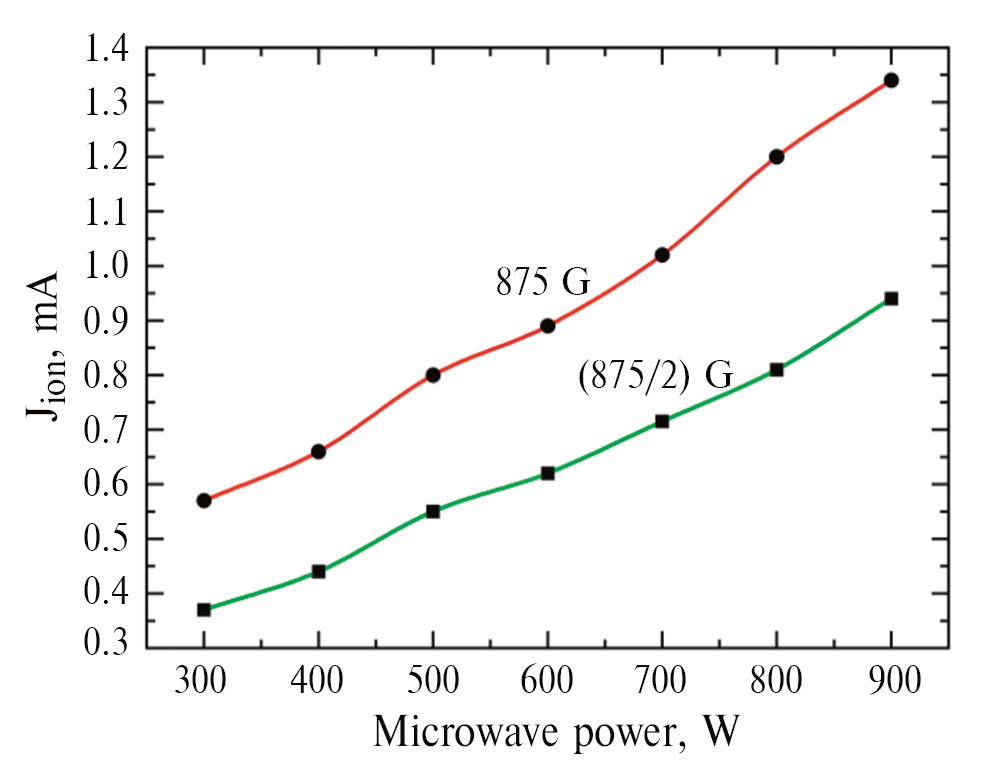 Зависимость тока насыщения Jion зонда Ленгмюра на оси камеры от напряженности магнитного поля показана на рис. 3 при давлении азота 1 мТорр и поглощаемой СВЧ мощности Pabs = 450 Вт. При напряженностях магнитного поля B1 = Br = 875 Гс и B2 = = Br /2 ≈ 438 Гс ток Jion проходит через максимумы. Величины этих максимумов зависят от давления газа и СВЧ мощности. Максимум при поле B1 соответствует ЭЦР, а максимум при поле B2 соответствует резонансу на второй циклотронной гармонике.