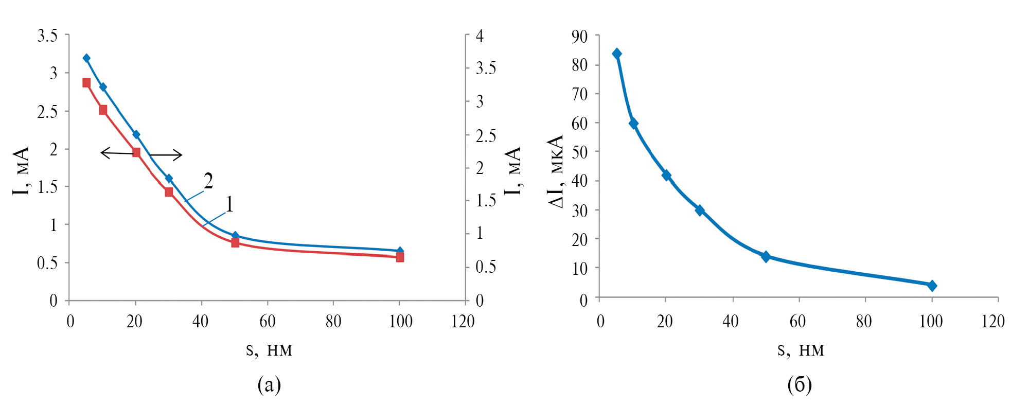 Установлено, что в двухслойных гетероструктурах при подключении отрицательного полюса источника питания к контактной площадке обогащенной углеродной пленки поперечный ток превышал ток при обратном включении. При уменьшении толщины обедненной пленки в интервале от 30 нм до 5 нм токи через гетероструктры и разности токов между токами при различной полярности подключения источника питания увеличиваются. При напряжении 30 В ток через гетероструктуру с удельным поверхностным сопротивлением обогащенного слоя основания 160 кОм/□ и толщиной обедненного слоя 5 нм, по сравнению с толщиной 100 нм, увеличивался от 0,6 до 3,8 мА, а разность между токами увеличилась от 4 до 86 мкА (рис. 1).