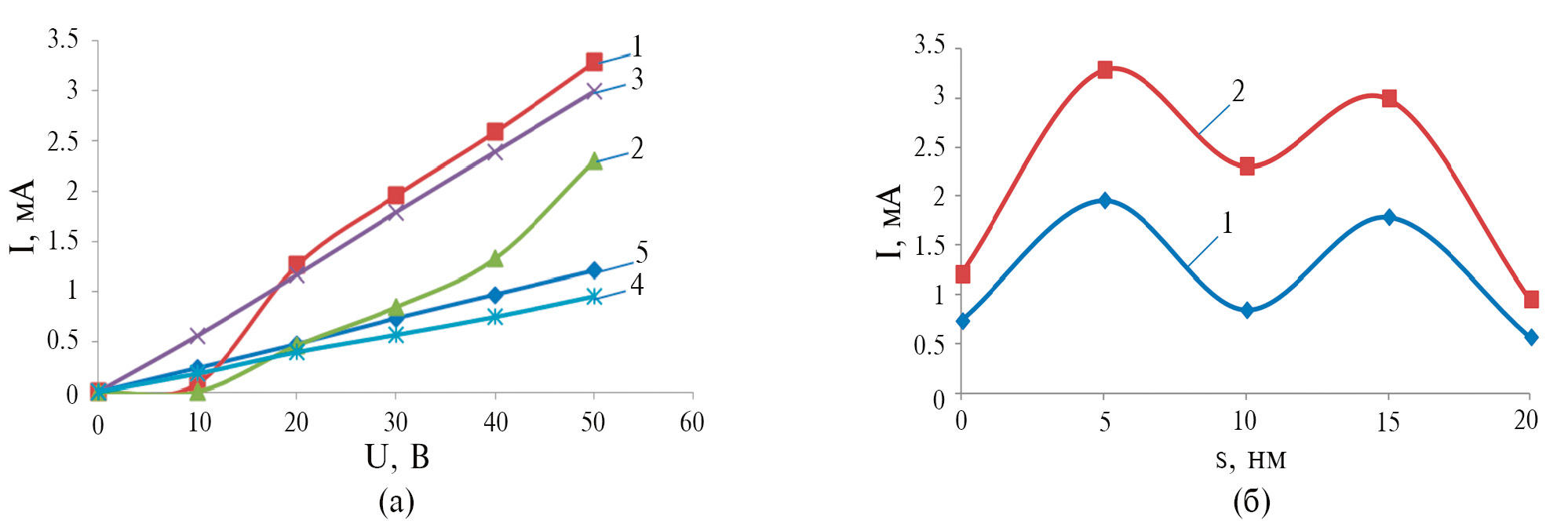 Рис. 2. ВАХи (а) и поперечные токи (б) при напряжениях 30 (1) и 50 В (2) в трехслойных гетероструктурах с различными толщинами обедненных слоев, нм: 1 – 5; 2 – 10; 3 – 15; 4 – 20; 5 – 0.