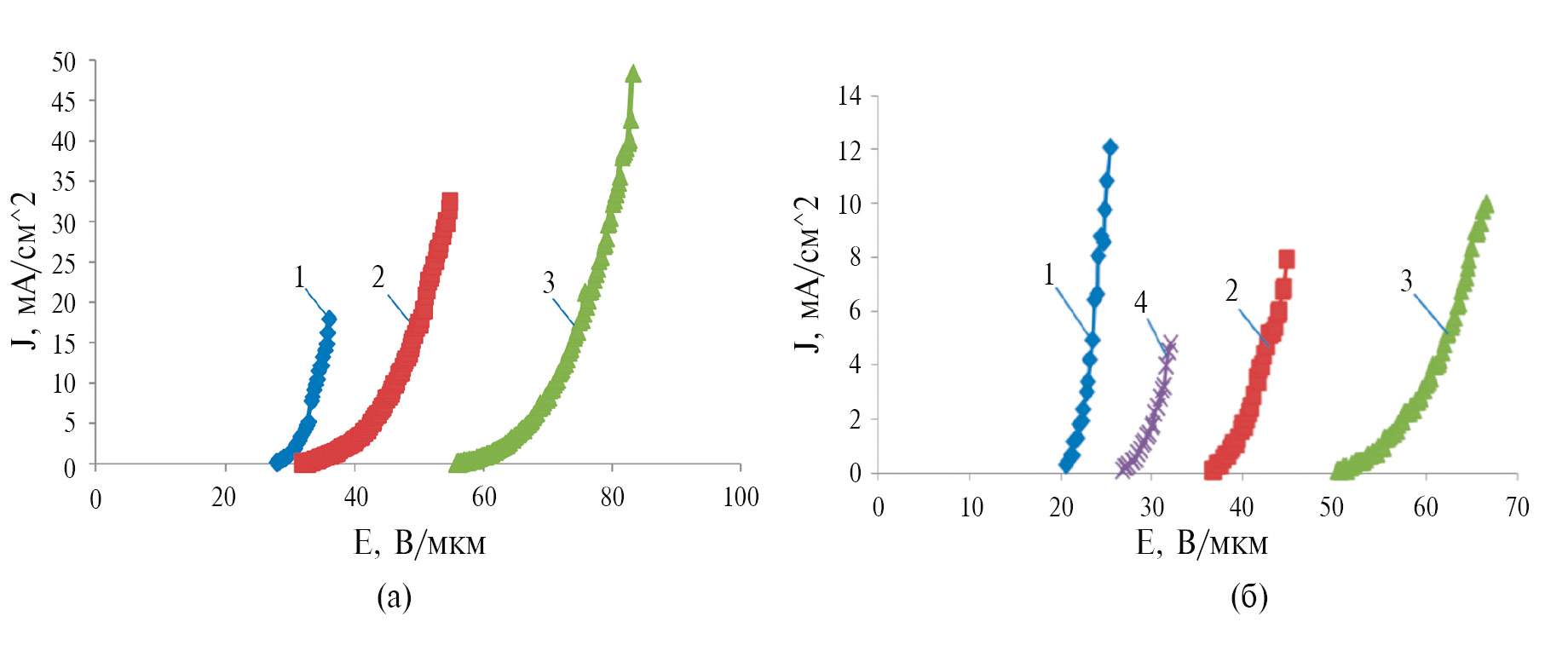 Функционирование ВИС основано на использовании полевой эмиссии электронов из металлов и полупроводниковых структур при напряженностях внешних электрических полей 106–107 В/см, что весьма близко к их электрической прочности [2]. Например, поле лавинного пробоя кремниевых кристаллов составляет всего 3 ∙ 105 В/см. Традиционным путем улучшения эмиссионных характеристик для всех видов автокатодов является уменьшение радиусов эмитирующих острий и диаметров отверстий в управляющих электродах, что определяется уровнем применяемой технологии изготовления [3]. Наиболее значительные успехи получены при создании на кремнии острийных решеток автоэмиссионных катодов с радиусом кривизны атомарных размеров (менее 1nm) [4], что позволяет существенно понизить рабочее напряжение. Однако усложнение технологии изготовления таких устройств сопровождается, как правило, снижением их надежности и увеличением себестоимости. В связи с этим большой фундаментальный и прикладной интерес представляют исследования альтернативных путей улучшения эмиссионных характеристик автокатодов, которые были бы связаны не только с конструктивными, но и с физико-химическими модификациями эмиссионных свойств материалов. Перспективным материалом для получения сильноточных полевых катодов являются нанокомпозитные углеродные пленочные структуры [5–8].