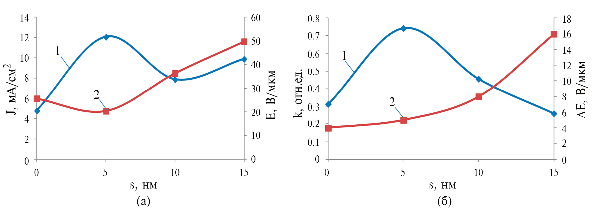 Рис. 4. Зависимости плотностей полевых токов (1), порогов активации эмиссии (2) (а), крутизны ВАХ (1) и интервалов допустимых напряженностей электрических полей (2) (б) от толщины обедненных слоев двухслойных гетероструктур.