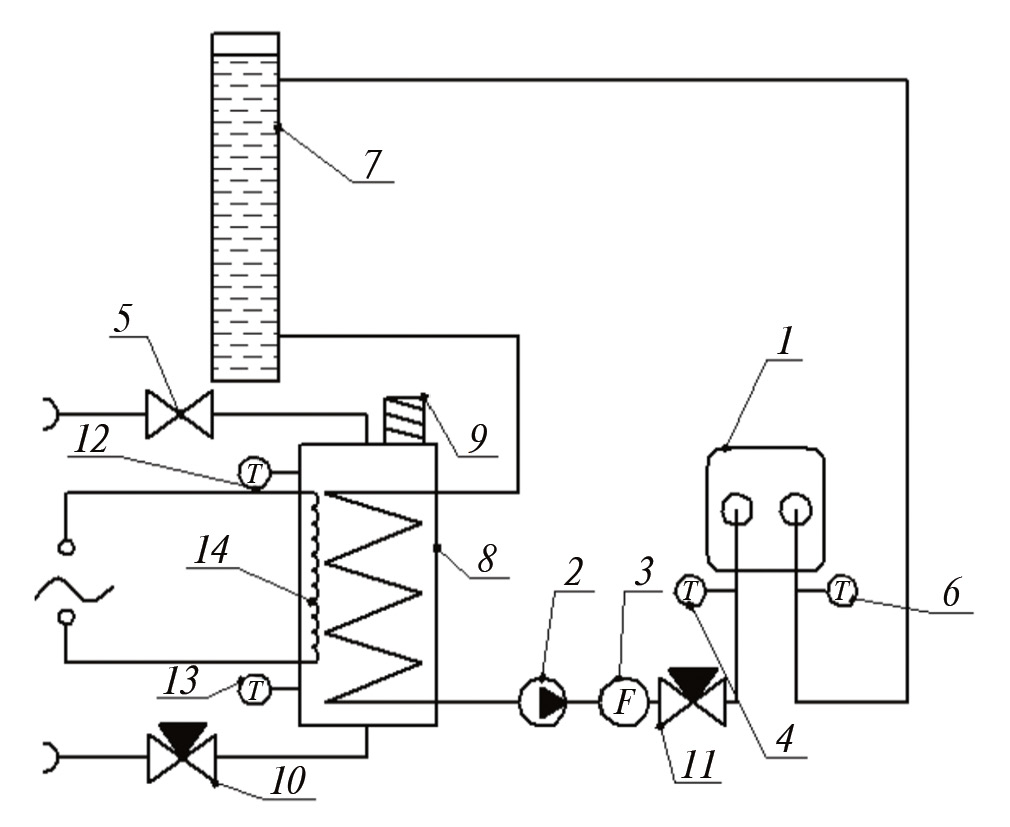 Рис. 2. Стенд для исследования охлаждения процессора компьютера: 1 –теплообменник на процессоре, 2 – помпа (насос), 3 – ротаметр, 4, 6, 12, 13 – термопары, 5 – запорный вентиль, 7 – расширительный бак, 8 – термостат с мешалкой с теплоэлектронагревателем и змеевиком холодильного агента, (холодильная машина), 9 – крышка для сепарации воздуха, 10, 11 – регулирующие вентили, 14 – нагреватель