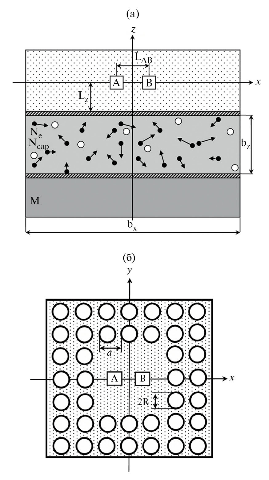Рассмотрим следующую модель электронного окружения для зарядового кубита на двойной квантовой точке. Будем считать, что кубит формируется в слое собственного полупроводника, где концентрация электронов при низкой температуре близка к нулю. Данный слой располагается на подложке, содержащей некоторое количество Ne электронов и Ncap ловушек, способных захватывать и удерживать в течение времени τion по одному электрону, если тот приближается к ловушке на расстояние, меньшее, чем критический радиус Rcap. Подложка представляет собой параллелепипед с размерами bx, by и bz вдоль декартовых осей, а начало отсчета координат помещено в его центр. Расстояние между центрами КТ А и КТ В кубита равно LAB, а расстояние от центров КТ до подложки составляет Lz. Ниже подложки находится металлический электрод, который выполняет функции затвора, создающего постоянное электрическое поле в области подложки, которое направлено вдоль вертикальной оси z. Если электрод отделяется от подложки изолирующим (диэлектрическим) слоем, то электроны, налетающие на него, упруго отражаются и уходят в назад подложку. Если такой слой отсутствует, то электрод превращается в сток, поглощающий электроны.