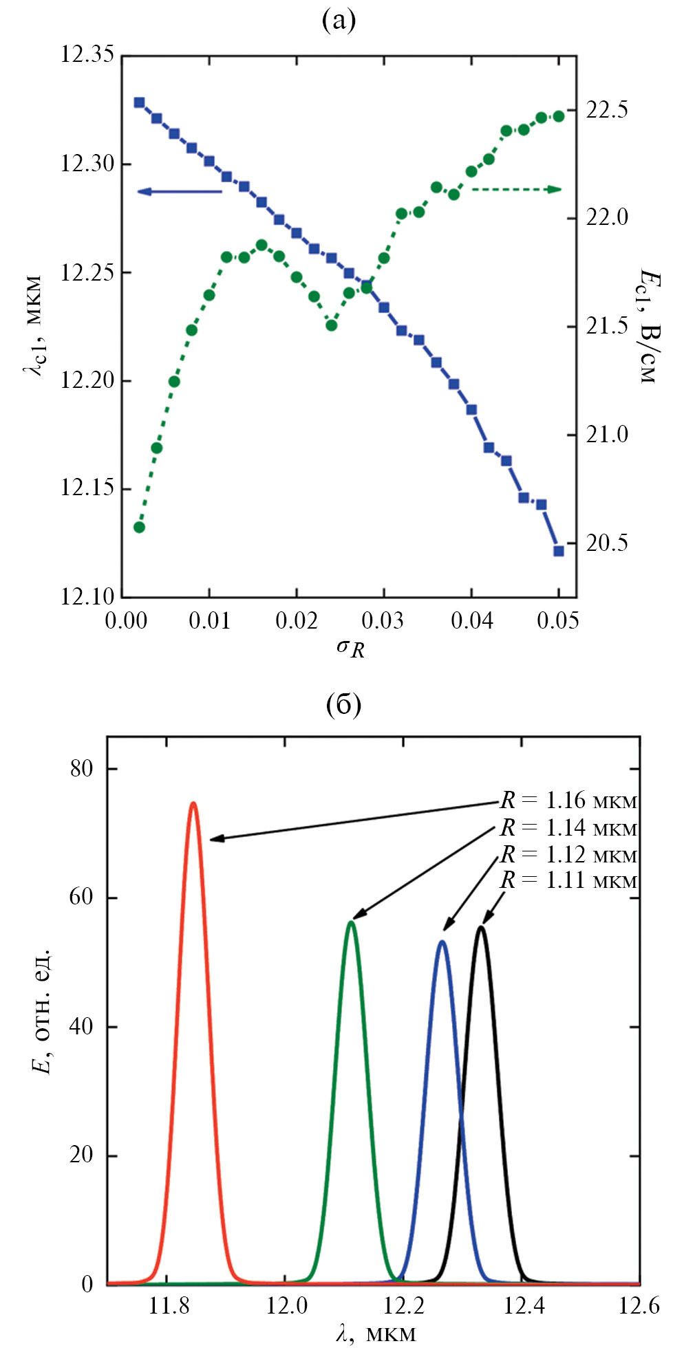 Рис. 3. Зависимость собственной длины волны λс1 моды и максимальной амплитуды однофотонного электрического поля Ес1 от среднеквадратичного отклонения σR радиуса R отверстий ФК 1 (а), а также зависимость усредненного по времени электрического поля Е от длины волны λ фотона (оптический спектр) при различных значениях R (б).