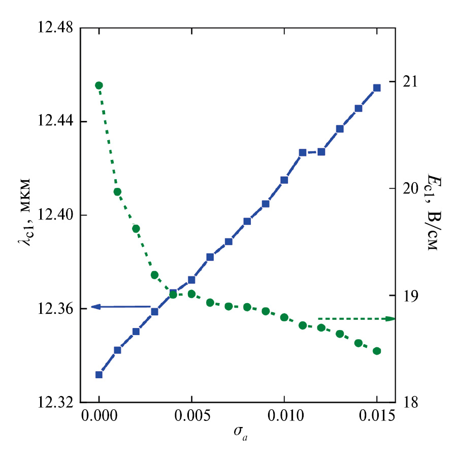 Рис. 5. Зависимость собственной длины волны λс1 моды и максимальной амплитуды однофотонного электрического поля Ес1 от среднеквадратичного отклонения σa постоянной решетки a отверстий ФК 1.