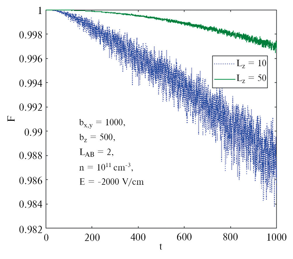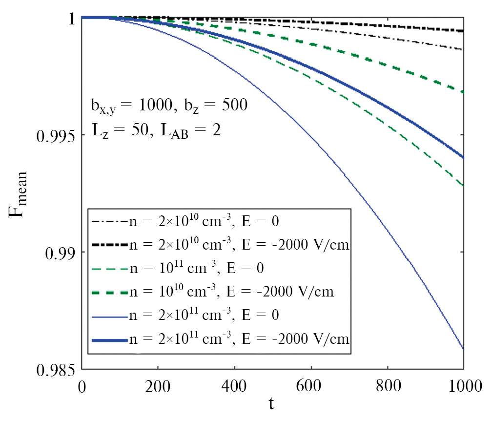 Наложение электрического поля, которое ориентировано вдоль оси z, на структуру, показанную на рис. 1, вызывает дрейф электронов к металлическому контакту. Стохастический характер движения носителей при этом сохраняется, но постепенно все они оказываются у спейсера, разделяющего контакт и полупроводник. Это приводит к формированию квазидвумерного электронного газа, толщина которого в вертикальном направлении зависит от тепловой энергии (скорости) электронов. Рост напряженности поля приводит к более быстрому уходу электронов из верхней части структуры. При этом влияние флуктуирующего поля, создаваемого ими, на электрон зарядового кубита уменьшается, и время хранения квантовой информации увеличивается. Результаты расчета усредненной точности воспроизведения как функции времени хранения приведены на рис. 6. Здесь и далее выбраны следующие параметры: bx,y = 1000, bz = 500, LAB = 2, L0 = 8, τ0 = 2, Ncap = 1, τion = 5, Rcap = 5. Мы предполагаем, что центры захвата (ловушки) отсутствуют в объеме резервуара. Количество независимых стохастических блужданий M = 5000. Каждая траектория содержит 500 актов рассеяния. Графики зависимостей Fmean(t), построенные для трех значений напряженности поля, демонстрируют квадратичный спад, в полном соответствии с теорией дефазировки для коротких промежутков времени. Видно, что сравнительно невысокая концентрация электронов n = = Ne/(bxbybz) = 1011 см–3 даже на значительном удалении резервуара от кубита (500 нм) вызывает определенное (до 0.2%) снижение точности воспроизведения на интервале 100 пс.