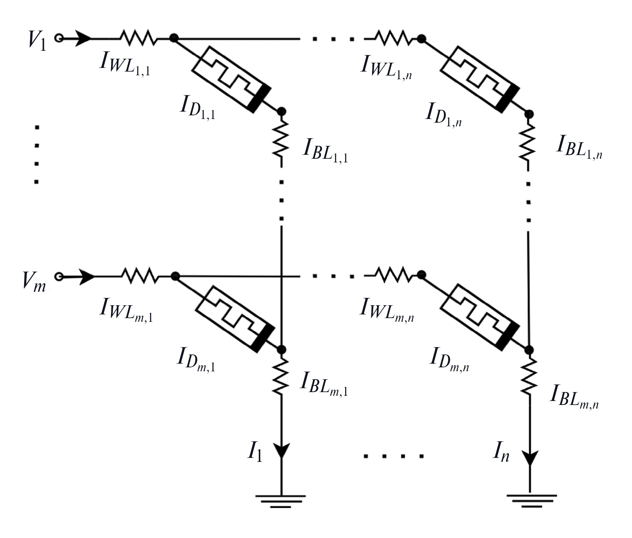 где Gi,j – проводимости мемристивных структур с индексами i, j; GWL, GBL – проводимости соединительных элементов строк и столбцов соответственно; VWL и VBL – падения напряжения на элементах соединительных линий; n и m – количество строк и столбцов в кроссбар-массиве.