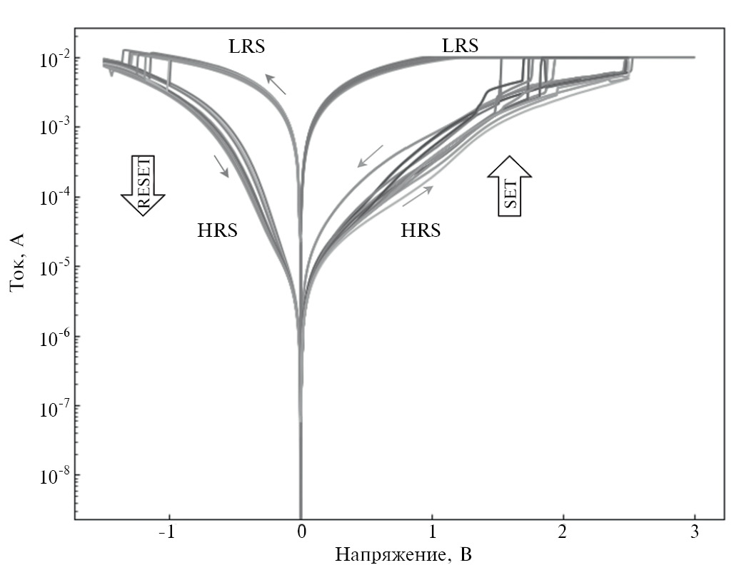 Рис. 5. Экспериментальные ВАХ мемристора на основе наноразмерной пленки TiOx для 20 циклов переключения. HRS и LRS – высокоомное и низкоомное состояния мемристора, соответственно.