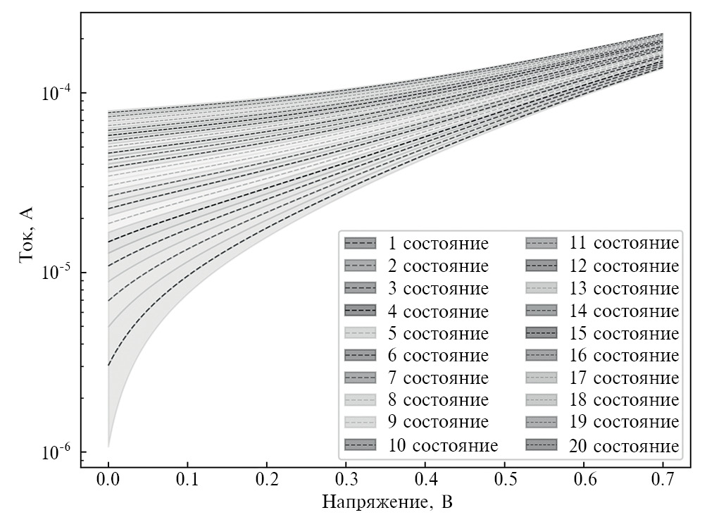 Вольт-амперные характеристики, каждая из которых соответствует одному из резистивных состояний мемристивного элемента, полученные c использованием приведенной аппроксимации экспериментальных ВАХ, представлены на рис. 7.