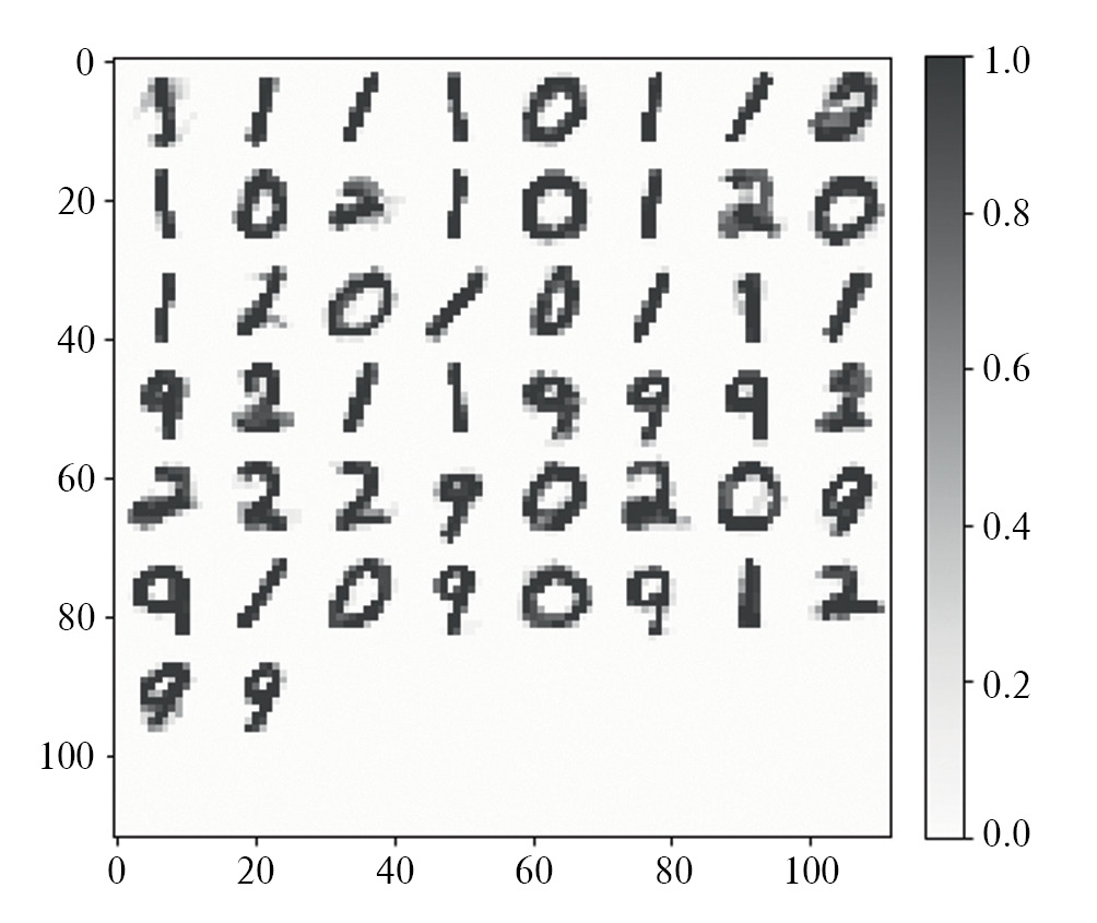Предобученная ИмНС представляла собой полносвязную нейронную сеть из 196 входных и 50 выходных нейронов. Использовалась модель нейронов с адаптивным порогом срабатывания и правилом обучения STDP (правило синаптической пластичности) для синаптических связей (весов) между слоями нейронов. Обучение проводилось с использование открытой базы данных изображений рукописных цифр MNIST [19]. Полученная матрица весов после программного обучения представлена на рис. 8. Каждый квадрат размером 14×14 элементов на рис. 8 соответствует синаптическим мемристивным элементам одного из пятидесяти выходных нейронов.