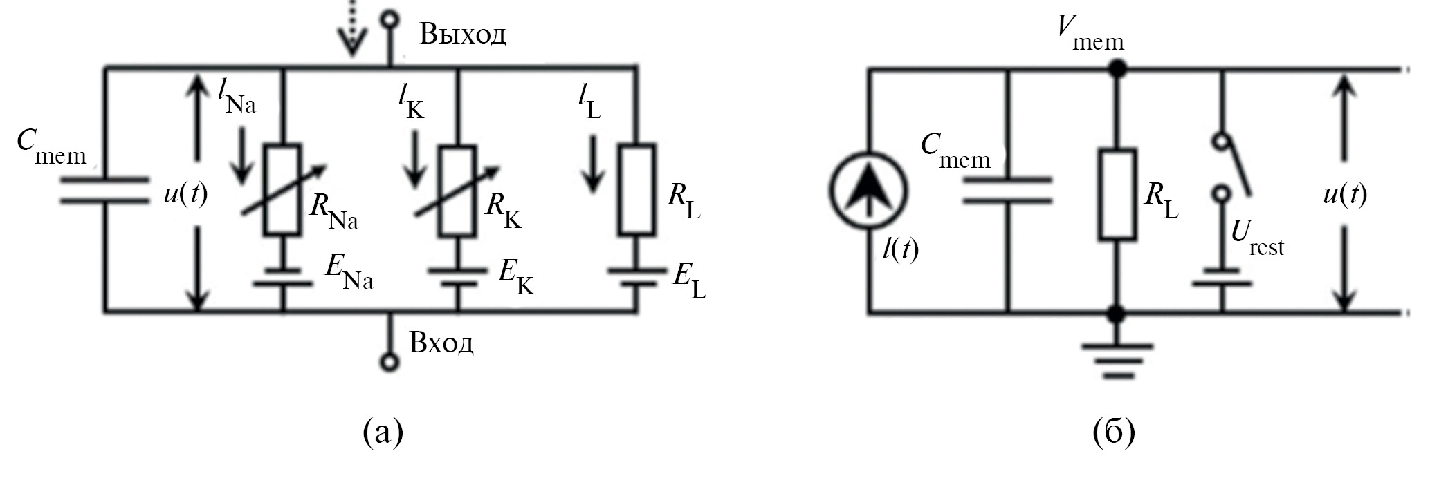 Рис. 3. Принципиальные схемы (а) модели нейронной цепи Ходжкина–Хаксли и (б) модели нейронной цепи LIF [59].