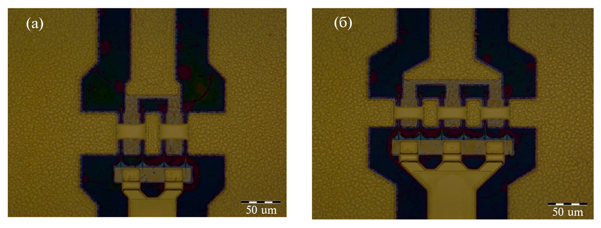 Рис. 7. Топология 4-х (а) и 6-секционного (б) транзисторов с межсоединениями в виде воздушных мостов (изображения получены с помощью оптической микроскопии).