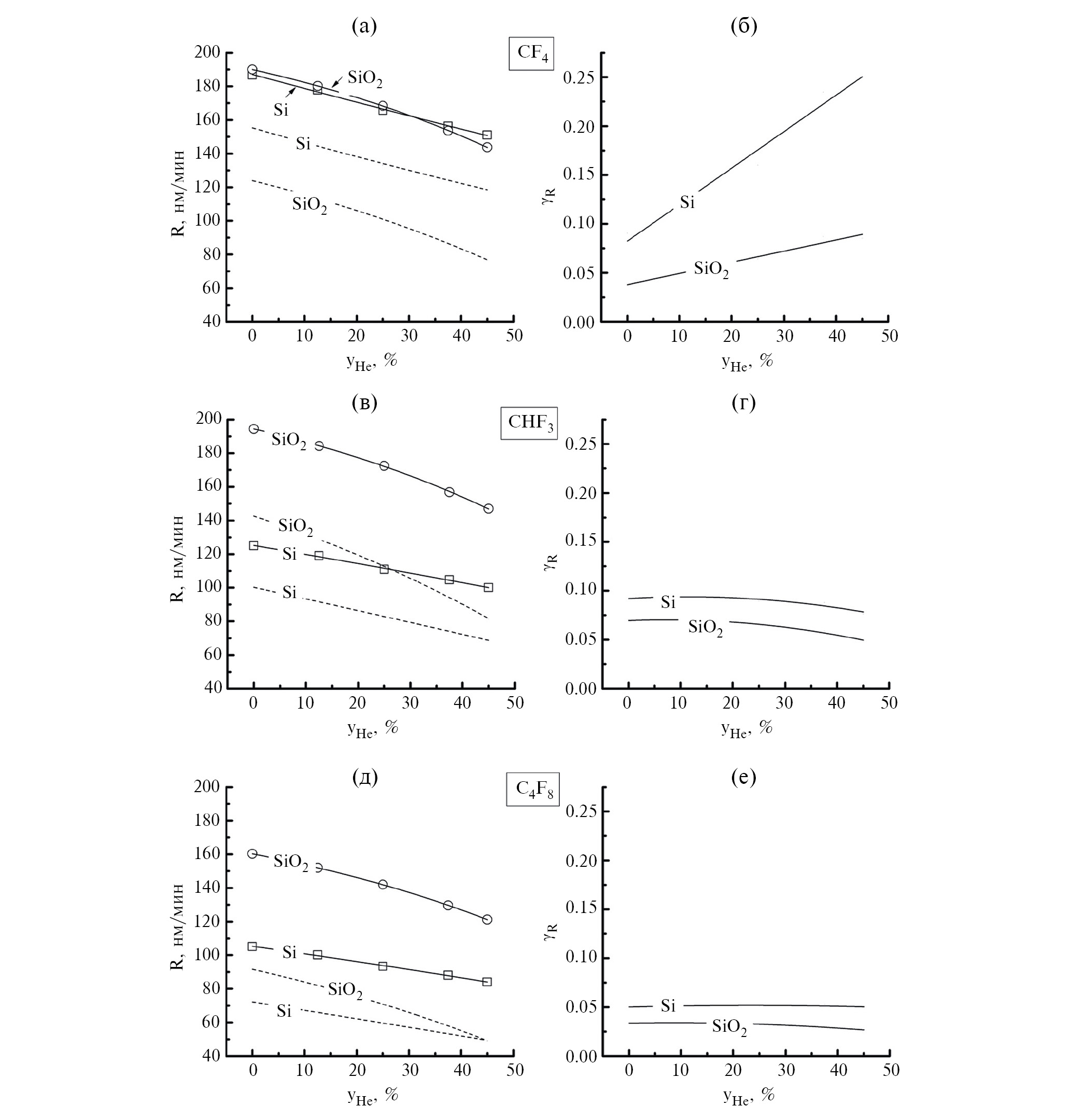 На рис. 3 (а, в, д) показано как содержание гелия в смеси влияет на скорости травления Si и SiO2 в условиях постоянства давления газа и вкладываемой мощности. Можно видеть, что максимальная скорость и минимальная селективность травления ожидаемо наблюдаются в смеси на основе тетрафторметана, которая отличается a) максимальной концентрацией атомов фтора (рис. 2(д)); и б) минимальной полимеризационной способностью в силу максимального значения . Последний факт неоднократно подтверждался в работах по экспериментальному исследования и моделированию плазмы различных фторуглеродных газов [8–10]. Монотонное снижение скоростей травления с ростом во всех трех смесях не согласуется с постоянством интенсивности ионной бомбардировки (рис. 1(г)), но качественно отслеживает изменение концентрации (рис. 2(г)) и плотности потока атомов фтора. Данный факт косвенно свидетельствует о протекании процесса травления в режиме лимитирования потоком нейтральных частиц. Для получения дополнительной информации по механизму травления мы провели оценку скоростей физического распыления ( ≈ 0.18–0.39 атом/ион для Si и 0.20–0.43 атом/ион для SiO2 при = 200–400 эВ) и определили химическую составляющую скорости для каждого из материалов как . На основании полученных данных можно заключить, что а) величина всегда составляет не менее 50% от наблюдаемой скорости травления и формирует характер ее зависимости от начального состава смеси; б) замещение аргона на гелий снижает как абсолютную величину , так и ее вклад в суммарную скорость травления, что в условиях ≈ const полностью согласуется с изменением плотности потока атомов фтора; и в) правило > справедливо лишь для плазмы тетрафторметана. Последний факт адекватно отражает различия в скоростях спонтанной и ионно-стимулированной химической реакции в условиях тонкой сплошной или дискретной полимерной пленки, которая даже при > обеспечивает практически одинаковый доступ атомов фтора к поверхности Si и SiO2. Расчеты эффективной вероятности гетерогенной химической реакции показали, что данная величина заметно возрастает в плазме CF4 + Ar + He (рис. 3(б)), но сохраняет близкие к постоянным значения при замещении аргона на гелий в системах CHF3 + Ar + He (Рис. 3(г)) и C4F8 + Ar + He (рис. 3(е)). Анализ этих различий на основе простейшего механизма, включающего стадии адсорбции атомов фтора на поверхности кремния R10: F → F(s.), собственно химической реакции R11: Si(s.) + xF(s.) → SiFx(s.) и десорбции продуктов в газовую фазу R12: SiFx(s.) → SiFx, приводит к следующим заключениям: