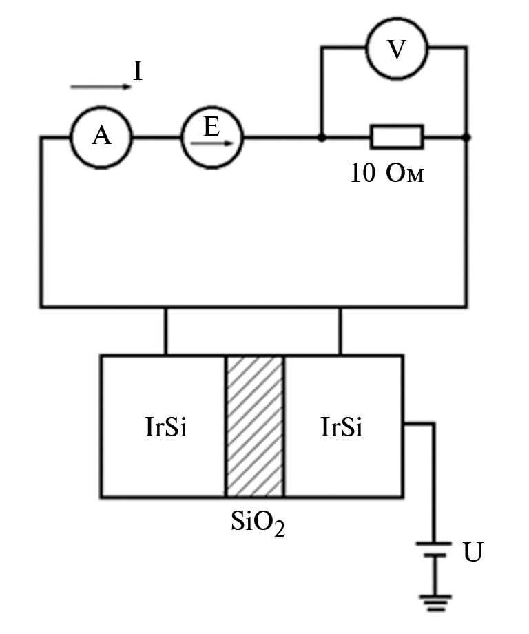 Реализация схемы, позволяющей измерять токи от 0,1 до 10 мкА приведена на рис. 1. При этом на пару электродов подавалось напряжение USi через резистор сопротивлением 10 МОм, последовательно подключенному к источнику напряжения Е. При этом ток, протекающий в цепи, ограничивался – сопротивлением на источнике и был равен 1 мкА для USi = 10 В. Данное ограничение введено с целью уменьшения разогрева контакта между иридиевой дорожкой и нанотрубкой.