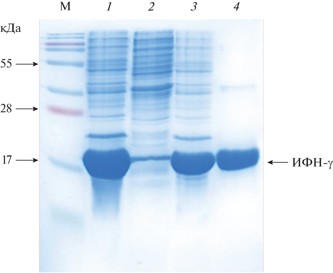 A recombinant strain producing human gamma interferon (IFN-γ) E. coli BL 21/pET-IFN-γ was constructed, providing a high level of its expression. A method has been developed for obtaining a soluble form of recombinant IFN-γ, consisting of the processes of producing a biomass of a producer strain containing a target protein in an amount of 32–37% of the total content of cellular proteins, protein isolation and purification. The purification process included the stages of disintegration, clarification of the cell lysate, chromatographic purification and dialysis. The developed method makes it possible to obtain from 1 g of wet biomass up to 5 mg of the drug with a purity of at least 95% and high specific (antiviral) activity.