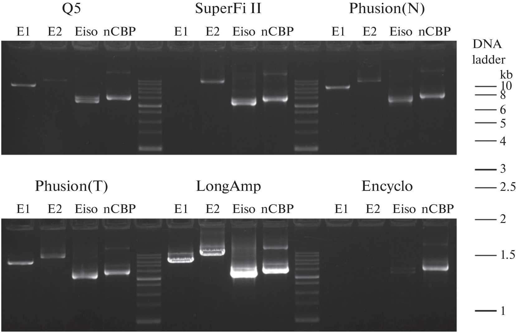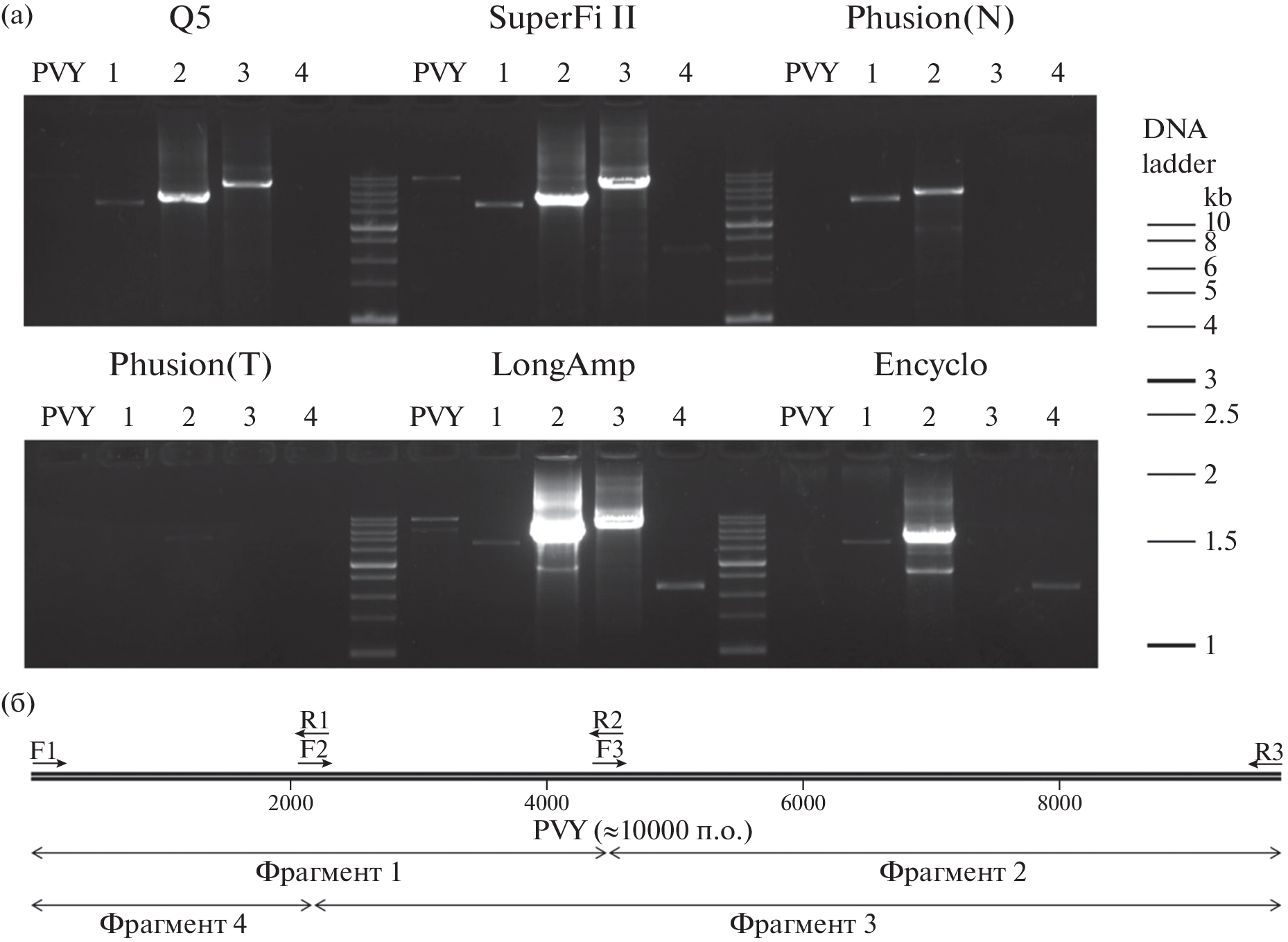 Amplification of long fragments from complex templates, such as eukaryotic genomic DNA, is considered a difficult task for most DNA polymerases. In this research, 6 variants of DNA polymerases were used to amplify full-length sequences from the genomic DNA of Solanum tuberosum genes encoding translation initiation factors of the eIF4E family, as well as for the synthesis of fragments of the potato Y virus genome from cDNA of potato plants infected by this virus. It was found that the efficiency of amplification by various DNA polymerases generally decreased with increasing length of the amplicons. LongAmp and Platinum SuperFi II polymerases demonstrated the highest efficiency in the synthesis of long fragments, which made it possible to synthesize PCR products with a length of more than 10,000 base pairs with high efficiency. The lowest efficiency was demonstrated by Encyclo polymerase. None of the DNA polymerases provided efficient amplification of all the studied DNA fragments. At the same time, any of the studied DNA fragments could be effectively amplified using at least one DNA polymerase variant. Thus, the choice of DNA polymerase was of key importance for the efficiency of the synthesis of a desired PCR product.