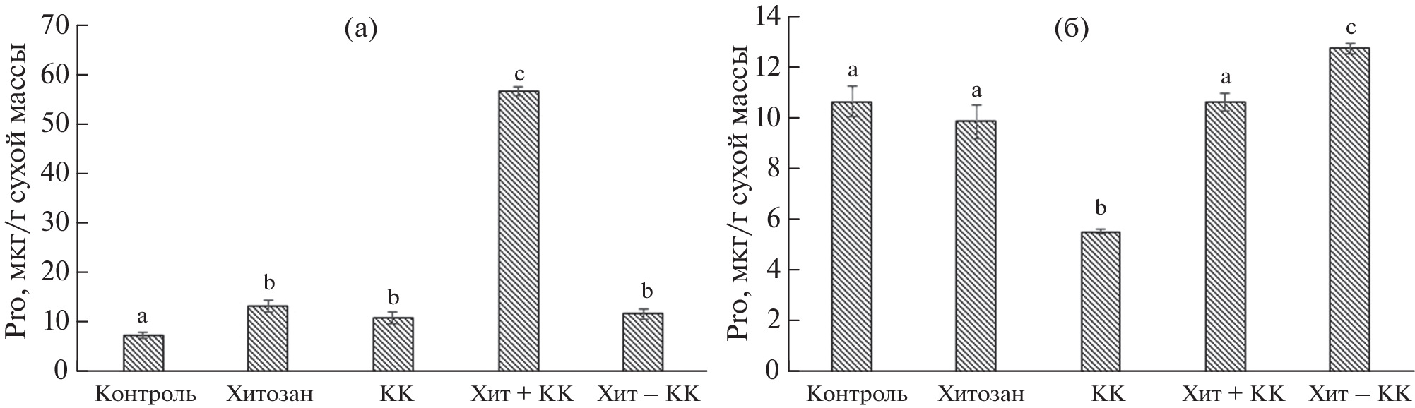 The article discusses the influence of caffeic acid (CA), its mix with chitosan (CHT + CA) and chitosan-based conjugate (CHT-CA) on growth and proline content of microclone potato plants (Solanum tuberosum L.) in in vitro culture under optimal conditions and under prolonged osmotic stress caused by polyethylene glycol. Under optimal conditions CHT-CA and CA, acting as moderate strength stressors, accelerate the growth and development of potato microclones and increase the proline accumulation in the stems. Under osmotic stress CA and CHT-CA promote the resistance of potato microclones and maintain their active growth. And such effect persists during the reparation period. The mechanical mix CHT + CA causes inhibition of microclonal plants’ growth and development accompanied by a significant accumulation of proline which is aggravated under stress.