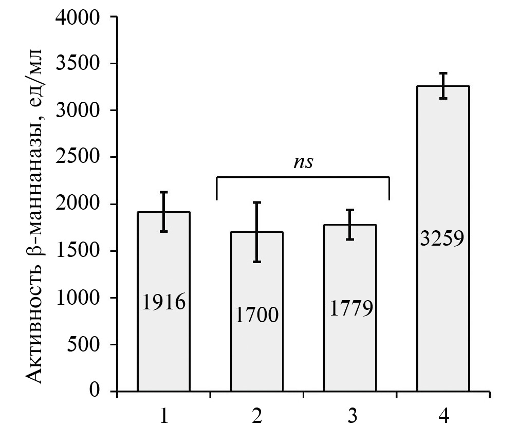 Рис. 3. Уровень активности маннаназы (ед./мл) в образцах с геном MANS под контролем промоторов: 1 — pOpMOX; 2 — pOhGAP; 3 — pOhFMD; 4 — pOhMOX. Пределы погрешностей показывают стандартное отклонение среднего значения активности 12 трансформантов. p < 0.05, ns — несущественное различие.