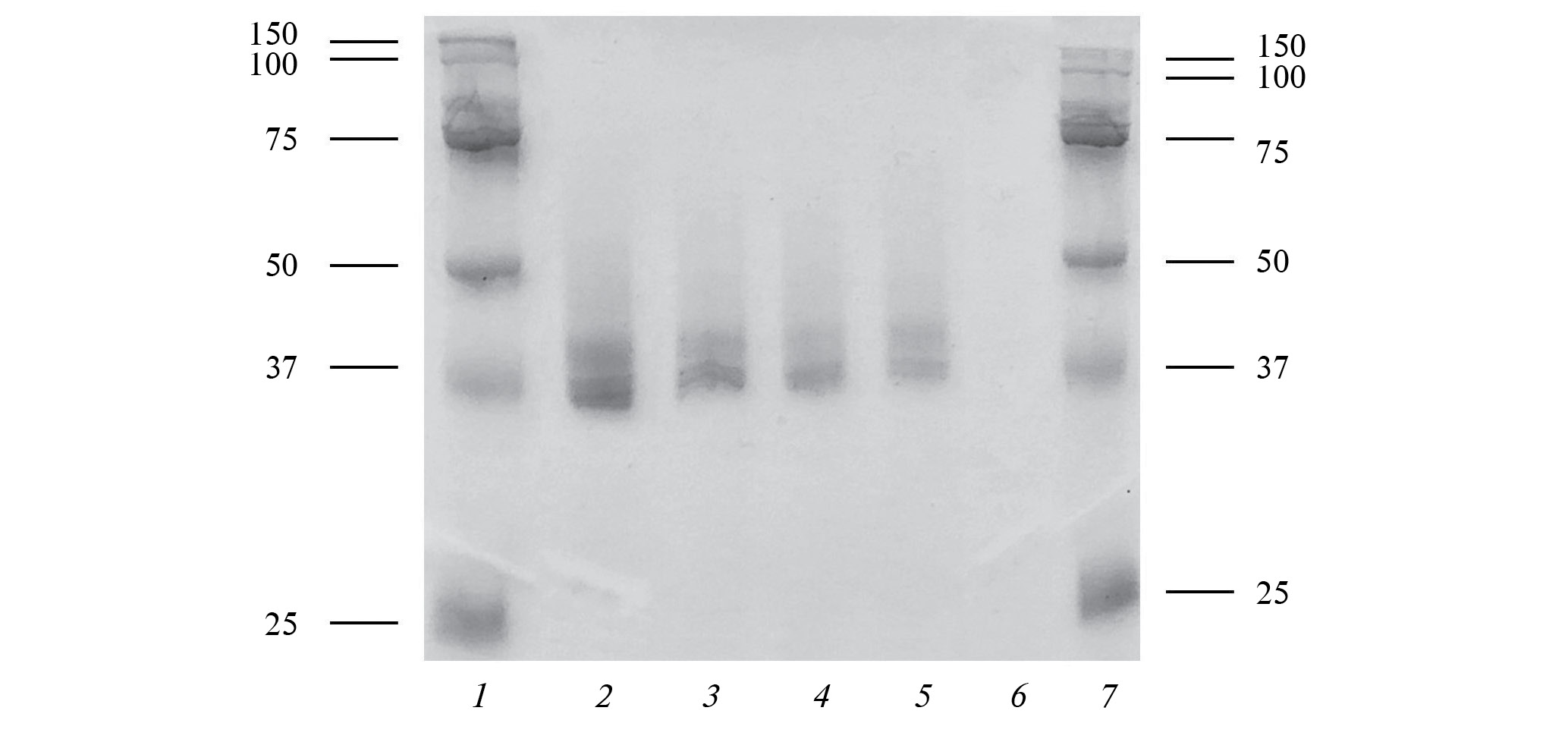 Рис. 4. Электрофорез в ПААГ с ДДС-Na рекомбинантной β-маннаназы, секретированной трансформантами O. haglerorum, содержащими плазмиды с промоторами pOhMOX, pOpMOX, pOhFMD и pOhGAP. 1, 7 — маркер молекулярной массы, кДа, 2 — pOhMOX, 3 — pOpMOX, 4 — pOhFMD; 5 — pOhGAP; 6 — образец с промотором pOpMOX в условиях без индукции.