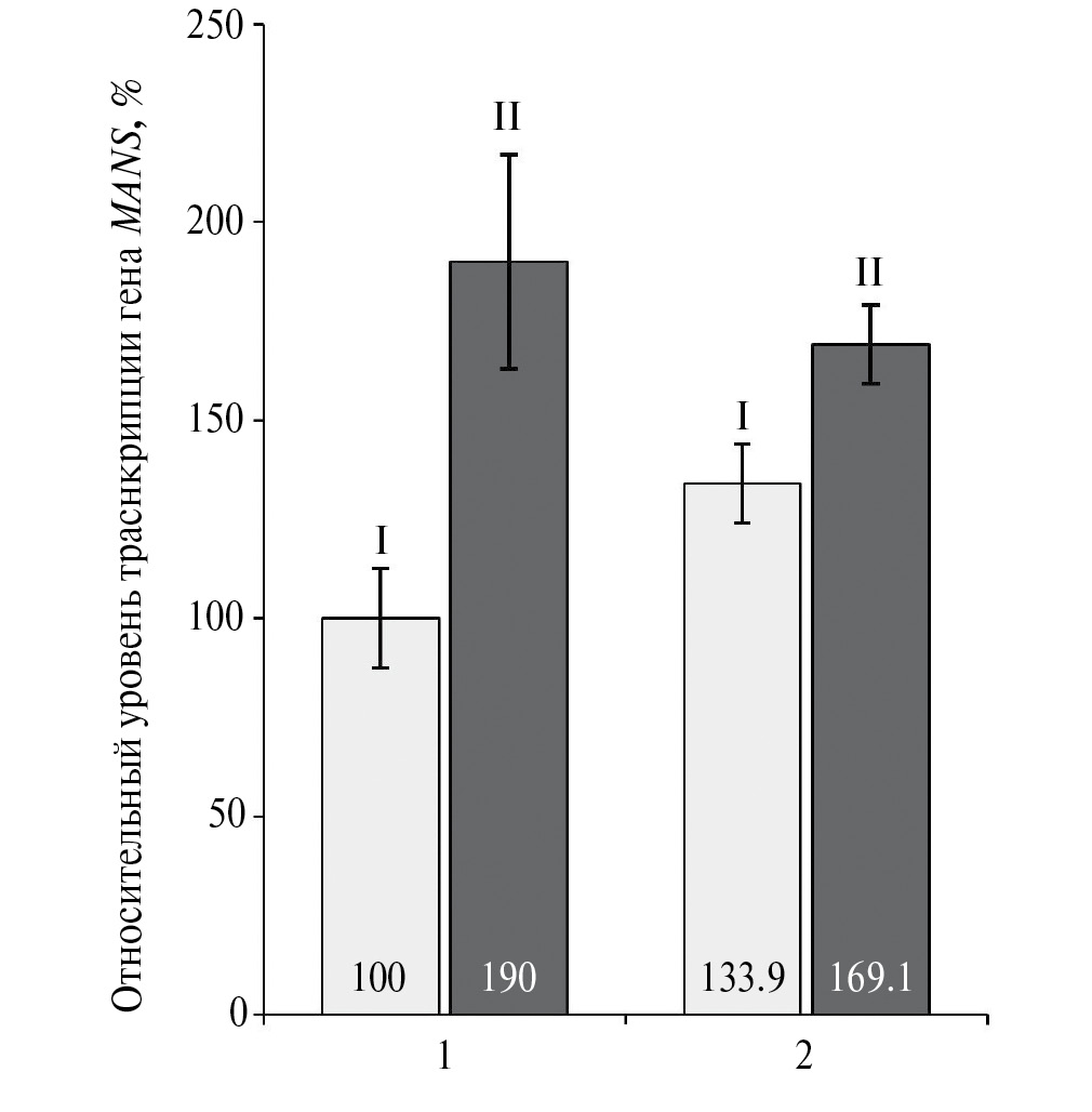 Рис. 5. Относительный уровень транскрипции гена MANS (%), находящегося под контролем промоторов pOhMOX (II) или pOpMOX (I). Показан средний уровень транскрипции гена MANS в 6 трансформантах с каждым из промоторов при культивировании в среде с метанолом в течение 12 (1) и 20 ч (2). Уровень транскрипции гена MANS под контролем pOpMOX через 12 ч индукции принят за 100%. Пределы погрешностей показывают стандартное отклонение для трех независимых экспериментов, p < 0.05.