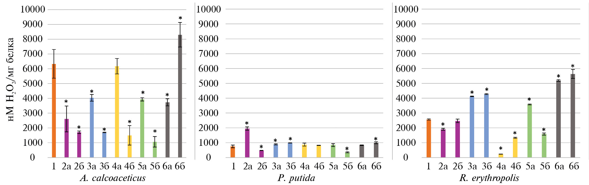 Рис. 4. Активность каталазы (нМ H2O2/мг белка) при воздействии антибиотиков на исследуемые штаммы бактерий: 1 — контроль; 2 — азитромицин; 3 — ампициллин; 4 — рифампицин; 5 — тетрациклин; 6 — цефтриаксон; а — 3 ч, б — 6 ч. * Отличия статистически достоверны при p < 0.05.