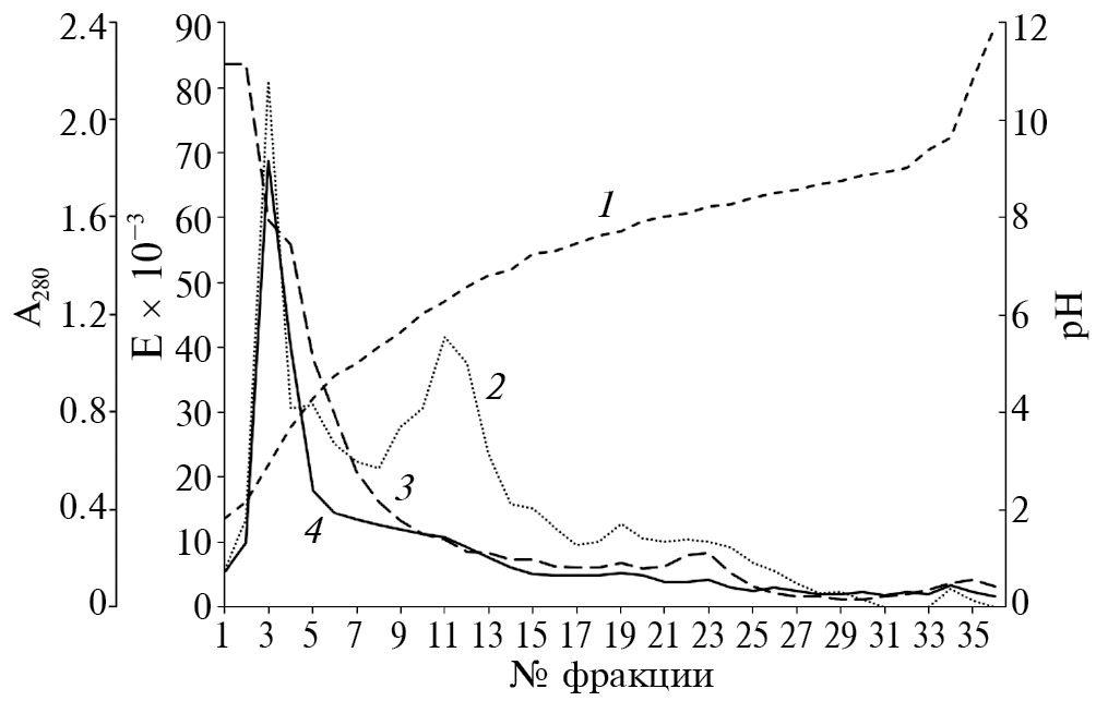 Рис. 1. Изоэлектрофокусирование внеклеточных белков культуральной жидкости A. tabacinus BEOFB3260m: 1 — pH, 2 — активность по отношению к субстрату S-2366 (E × 10–3), 3 — A280, 4 — активность по отношению к субстрату Chromozym TH (E × 10–3).