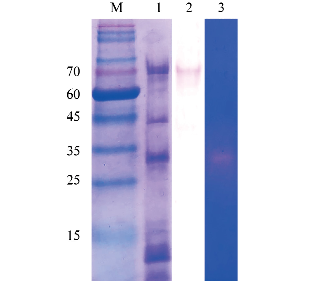 Рис. 2. Электрофоретический анализ внеклеточной протеазы A. tabacinus в ПААГ с ДСН-Na: М — метчики; 1 — электрофореграмма по Лэммли; 2 — окраска на наличие углеводного компонента; 3 — казеиновая зимограмма.