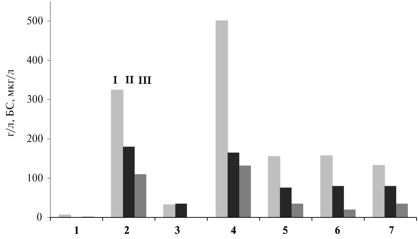 Рис. 1. Корреляция суммарного содержания БС (I, мкг/л) в гуминовых препаратах с содержанием гуминовых веществ (II – гуминовые вещества, г/л; III — гуминовые кислоты, г/л): 1 — жидкий биогумус, 2 — лигногумат марки В калийный, 3 — гидрогумат калия, 4 — HumiFirst, 5 — “SatoHum”®K, 6 — “SatoHum®Complex”, 7 — “SatoHum®К-G24”.