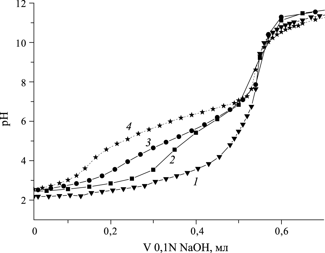 Рис. 4. Кривые потенциометрического титрования образцов N-мХТЗ (1), мХТЗ 1 (2), мХТЗ 3 (3), исходный ХТЗ (4).
