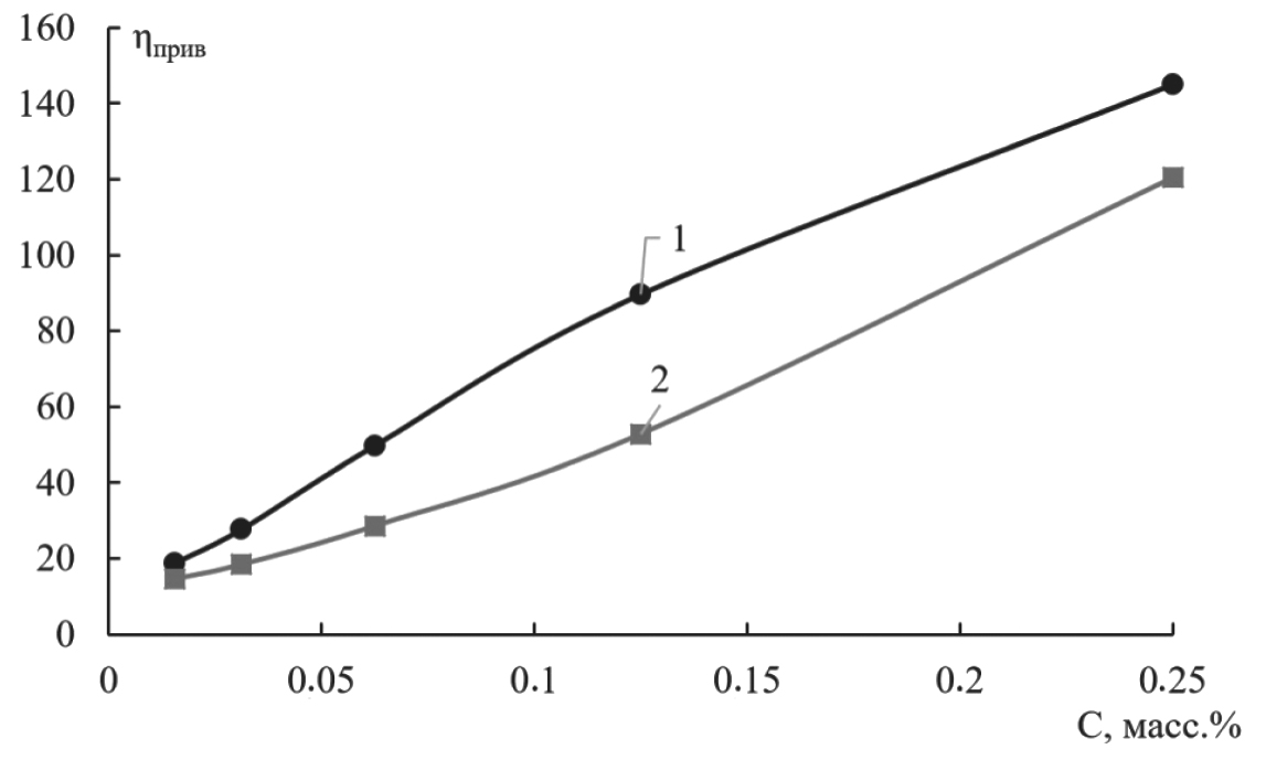 На рис. 1 приведена зависимость ηприв от концентрации С для хитозана и комплекса ХТЗ-М, которая определяется гидродинамическими характеристиками макромолекулы. Размер макромолекулярного клубка зависит от сродства полимера и растворителя. Характер зависимости приведенной вязкости от концентрации в исследованном диапазоне нелинейный, это связано с высокой MМ хитозана. В области более разбавленных растворов С < 0.1% характер кривых приближался к линейному, и можно видеть, что наклон кривой ηприв = f(C) в случае комплекса с меланином выше, что свидетельствует о большем гидродинамическом радиусе макромолекулы по сравнению с размерами макромолекулярного клубка хитозана в том же растворителе. Это факт должен влиять на реологическое поведение формовочных растворов биополимеров.