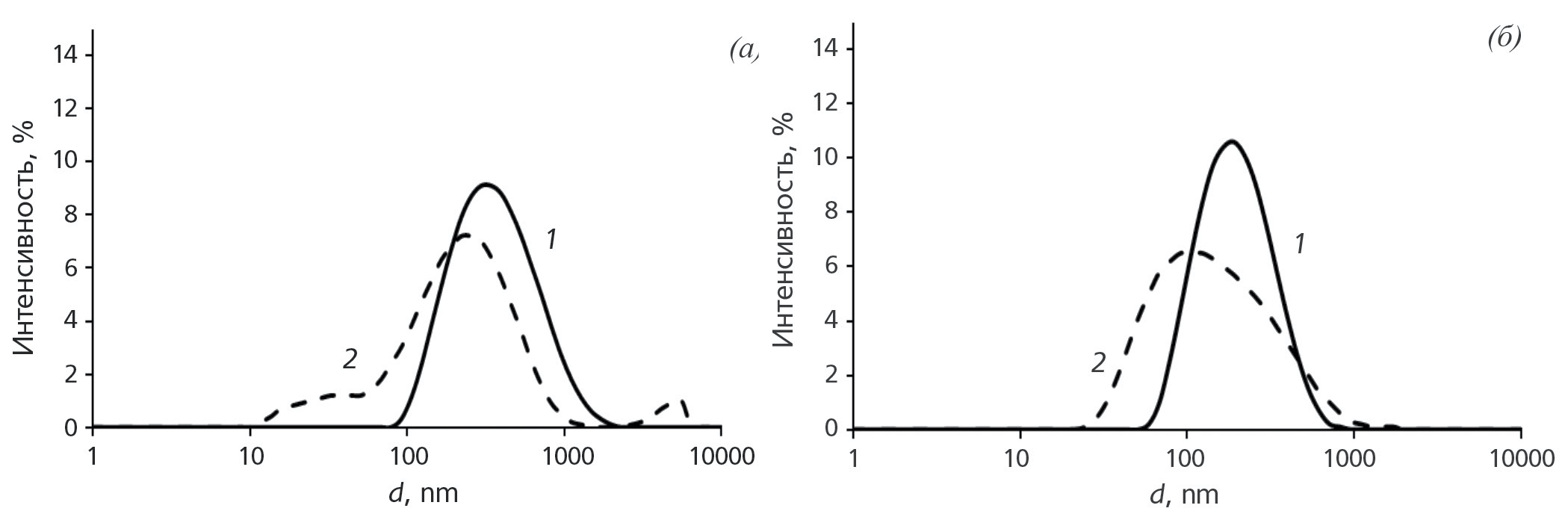 Рис. 3. Распределение по размерам частиц комплекса ЛПС : ХН-110 1 : 7 (а) и ЛПС : ХН-5 1 : 5 (б) в воде (1) и в присутствии сыворотки (2).