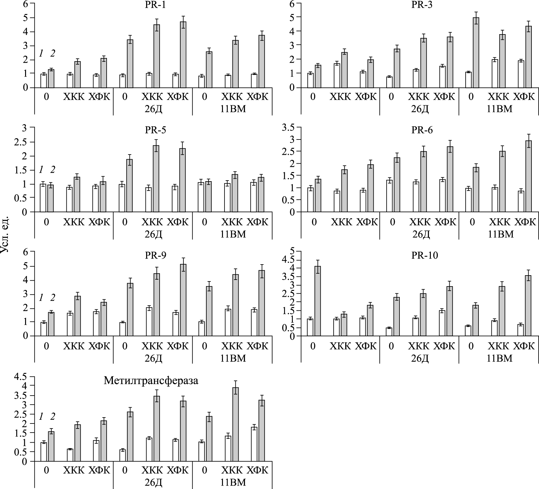 Рис. 3. Влияние конъюгатов ХКК и ХФК в композициях с B. subtilis 26Д и B. subtilis 11ВM на транскрипционную активность генов PR-белков в растениях картофеля через 72 ч после инфицирования P. infestans: 1 — контроль, 2 — заражение P. infestans.