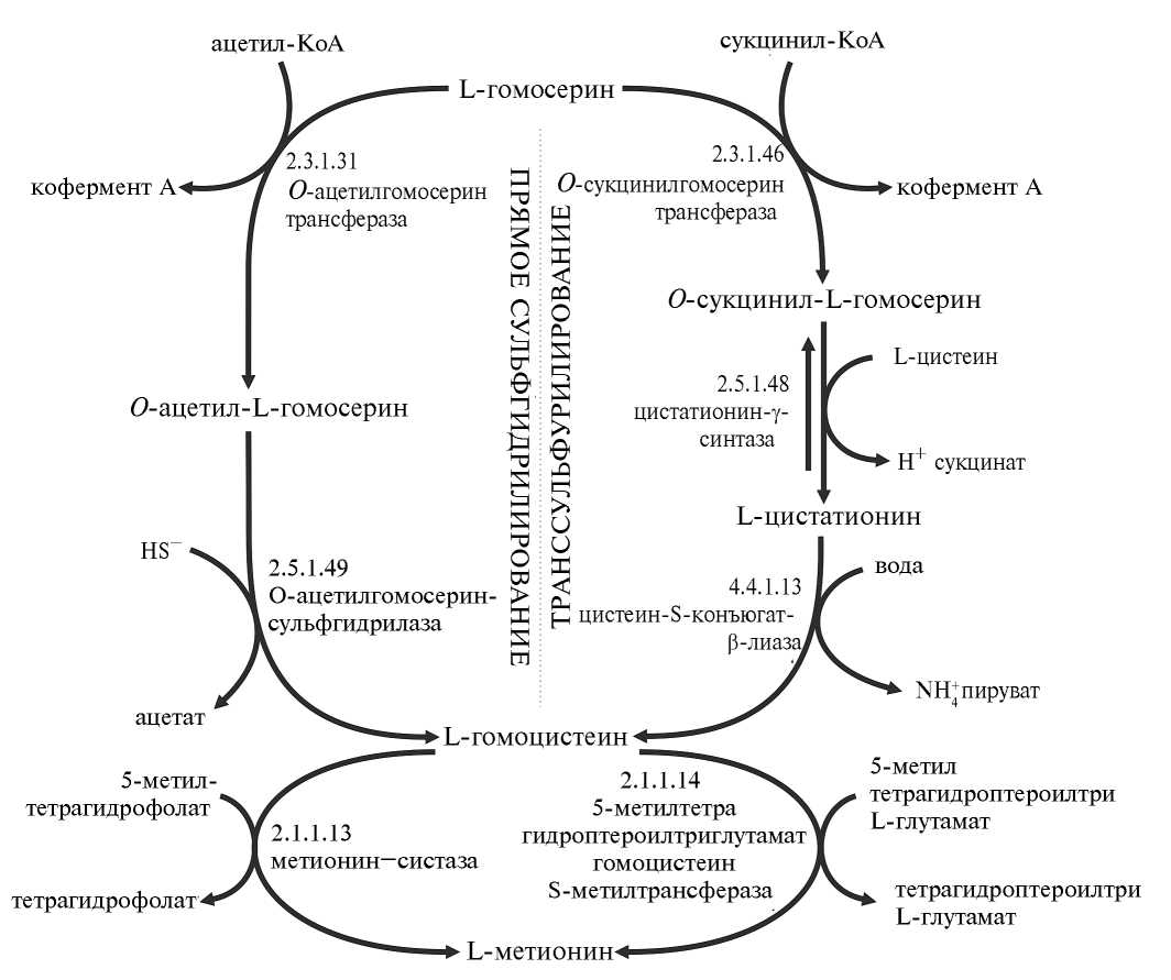 Метаболический путь биосинтеза метионина в бактериях наиболее подробно охарактеризован у Escherichia coli [7, 8]. В клетках E. coli предшественник метионина гомоцистеин синтезируется по пути транссульфурилирования из О-сукцинил-L-гомосерина в две стадии (рис. 1), катализируемые цистатионин γ-синтазой (CGS, КФ 2.5.1.48) и цистатионин β-лиазой (CBL, в настоящее время включена в КФ 4.4.1.13, цистеин-S-конъюгат β-лиаза). В большинстве классов бактерий, в отличие от E. coli, преобладающим является путь прямого сульфгидрилирования (рис. 1), либо используются оба пути [9], что обеспечивает метаболическую гибкость и адаптивность микроорганизмов. Функциональность обоих путей подробно исследована у таких бактерий как Pseudomonas aeruginosa [10], P. putida [11], Corynebacterium glutamicum [12–14], Leptospira meyeri [15, 16], Thermus thermophilus [17, 18], Streptococcus anginosus [19]. Анализ геномов выявил, что транссульфурилирование, как единственный путь биосинтеза метионина, присутствует в основном в протеобактериях [9].