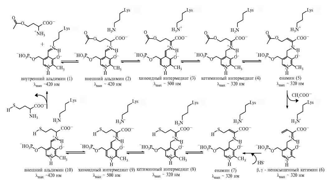 ПЛФ-зависимые ферменты используют один и тот же кофактор для катализа различных реакций, поэтому промежуточные стадии катализа имеют много общего [42], при этом белковая матрица обеспечивает реакционную и субстратную специфичность этих ферментов. Механизмы, посредством которых ПЛФ-зависимые ферменты контролируют переходные состояния кофактора в процессе катализа, исследуются при помощи рентгеноструктурного анализа и сайт-направленного мутагенеза. Для ряда ПЛФ-зависимых ферментов, участвующих в биосинтезе L-метионина, были получены мутантные формы [23, 38, 43–45], исследование которых позволило сделать предположения о роли отдельных аминокислотных остатков в катализе. Анализ кинетических и спектральных свойств, а также имеющихся кристаллических структур ферментов и комплексов фермент-ингибитор позволяет сделать предположение о механизме реакций, катализируемых этими ферментами [42, 39, 46–50].