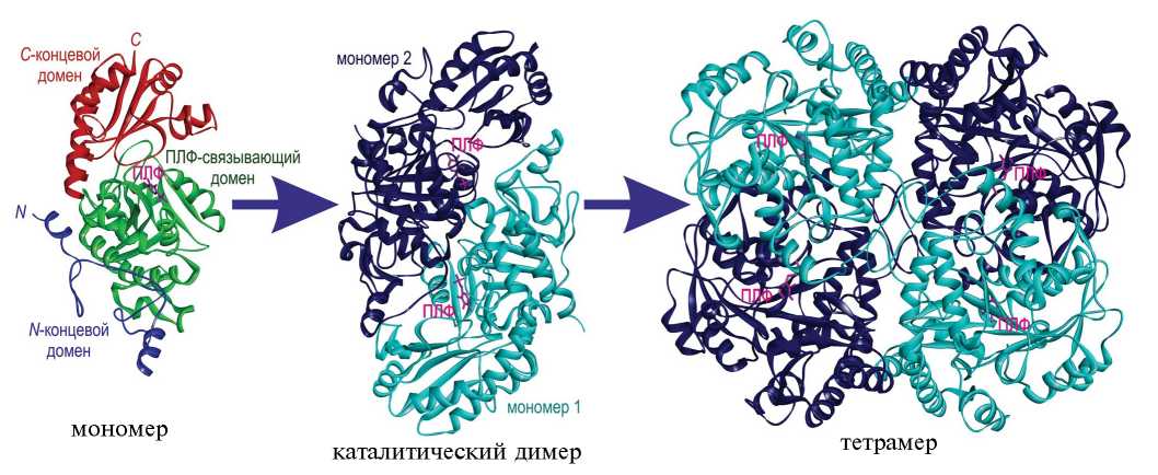 OAHS принадлежит к первому структурному классу ПЛФ-зависимых ферментов, подклассу CBL [42]. В настоящее время определены семь пространственных структур OAHS из пяти источников: T. thermophilus (pdb 2CTZ, 2CB1) [18], W. succinogenes (pdb 3RI6) [51], M. marinum (pdb 4KAM) [52], T. maritima (pdb 7KB0, 7KB1) [28] и C. jejuni (pdb 4OC9). Функциональной единицей фермента является димер (рис. 5), однако, как и многие ПЛФ-зависимые ферменты, OAHS существует в растворе в виде тетрамера или гексамера, что подтверждается как биохимическими, так и структурными данными [18, 27, 31, 36, 37, 51, 52]. Отдельный мономер представляет собой α/β белок, состоящий из 421–453 аминокислот, уложенных в 11–14 α-спиралей, несколько 310-спиралей и 11, 12 или 14 β-слоев (рис. 5). Мономер состоит из трех доменов, что характерно для всех ПЛФ-зависимых ферментов первого типа укладки, включая ферменты сульфурилирования, участвующие в биосинтезе метионина [42, 53]. Небольшой N-концевой домен состоит из двух α-спиралей, соединенных длинной петлей, способствует образованию тетрамера, а также совместно с аминокислотными остатками большого ПЛФ-связывающего домена соседней субъединицы формирует активный центр фермента. Большой ПЛФ-связывающий домен состоит из β-слоя, окруженного α-спиралями, и содержит большинство каталитических остатков активного центра (рис. 5, табл. 2), в том числе ковалентно связанный с ПЛФ остаток лизина, образующий внутренний альдимин. С-концевой домен содержит четырехслойную β-структуру, которая образует субстрат-связывающий карман в активном центре, закрытый α-спиралями. Активный центр OAHS, расположенный на границе раздела димеров, образован аминокислотными остатками обеих субъединиц, таким образом, молекула гомотетрамера содержит четыре активных центра (рис. 5).