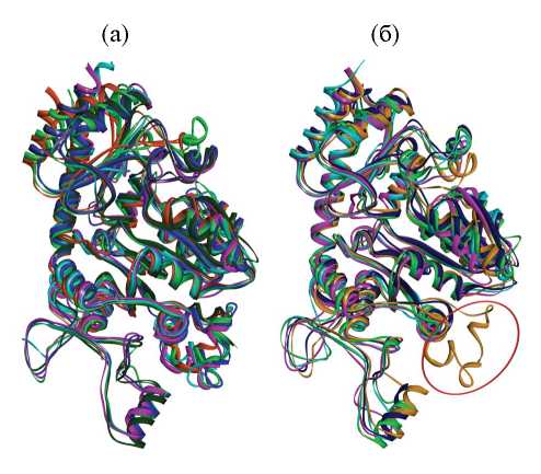 Рис. 6. Наложение полипептидных цепей (а) пространственных структур OASH из разных микроорганизмов: C. jejuni OAHS (pdb код 4OC9) – темно-синий, M. marinum OASH (pdb код 4KAM) – голубой, T. maritima OASH (pdb код 7KB1) – пурпурный, T. thermophilus OASH (pdb код 2CTZ) – зеленый, T. thermophilus OASH (pdb код 2CB1) – темно-зеленый, W. succinogenes OASH (pdb код 3RI6) – оранжевый; (б) пространственных структур ферментов подкласса CBL: T. maritima OASH (pdb код 7KB1) – оранжевый, Citrobacter freundii метионин γ-лиаза МГЛ (pdb код 2RFV) – темно-синий, Arabidopsis thaliana CBL (pdb код 1IBJ) – голубой, Nicotiana tabacum CGS (pdb код 1I41) – зеленый, S. cerevisiae цистатионин γ-лиаза (pdb код 1N8P) – пурпурный. Овалом выделен уникальный фрагмент, характерный для фермента OASH.
