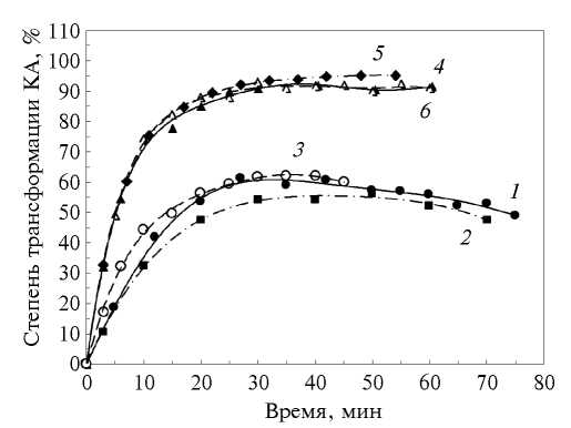 На рис. 2 представлены кривые накопления цефалоспоринов в ходе их биокаталитического синтеза, катализируемого IECASA, в виде зависимости степени трансформации КА в целевой продукт от времени. Они имеют плато различной протяженности. Продолжительные плато, характерные для процессов синтеза цефалоспоринов, несущих ацильную часть TzAA (кривые 4–6, рис. 2), свидетельствуют о благоприятном для биокаталитического ацилирования соотношении скоростей синтетазного и гидролитических процессов (рис. 1). Кривые накопления продуктов синтеза цефалоспоринов, несущих ацильную часть MA, имеют более или менее выраженные максимумы (кривые 1–3, рис. 2) вследствие доминирования гидролитических процессов над процессом собственно синтеза. В табл. 3 приведены максимальные достигаемые концентрации целевых цефалоспоринов (Сцеф, мМ) в реакционных смесях (на плато или в максимуме кривых накопления продукта).