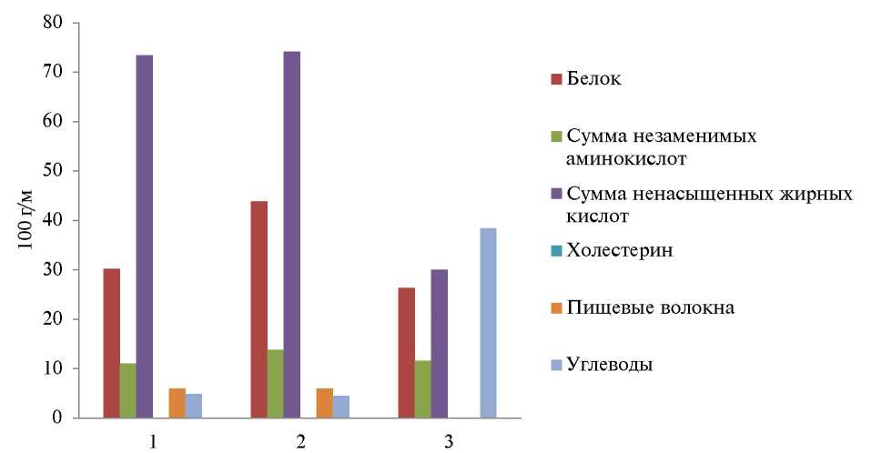 Рис. 3. Состав шрота семян тыквы (1), продукта сквашивания шрота тыквенных семян (2) и кисломолочного продукта (3).