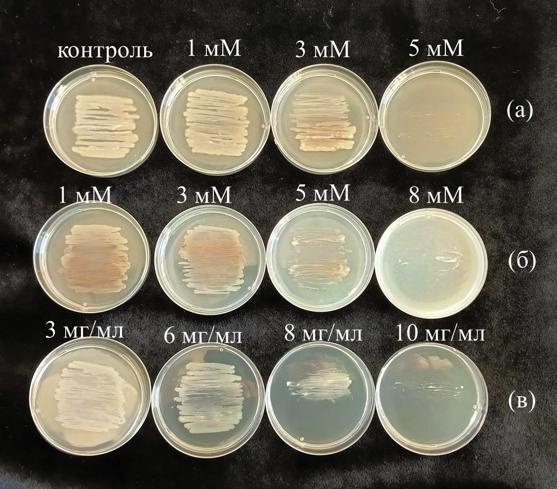 Рост штамма Pseudomonas sp. OBA 2.4.1. на питательных средах с ТМ и глифосатом. Микроорганизмы могут по-разному переносить токсичность металлов [3]. Устойчивые к воздействию ТМ штаммы бактерий, обладающие ростостимулирующим действием, имеют особую ценность. В рамках нашего исследования был изучен рост штамма Pseudomonas sp. OBA 2.4.1 на средах с добавлением различных концентраций ТМ и гербицида. Показано, что на средах с добавлением NiCl2 до 3 мМ он способен активно расти, а при концентрации 5 мМ роста не было (рис. 2а). При посеве штамма на среды с различными концентрациями Pb(CH3COO)2 было показано, что он был способен расти на среде LB с добавлением 3 мМ Pb(CH3COO)2, а при внесении 5 мМ было заметно значительное угнетение роста бактерий, а при 8 мМ роста уже практически не наблюдалось (рис. 2б). На средах с добавлением глифосата Pseudomonas sp. OBA 2.4.1 рос при концентрации до 6 мг/мл, ингибировался при 8 мг/мл, при 10 мг/мл роста бактерий не было (рис. 2в).
