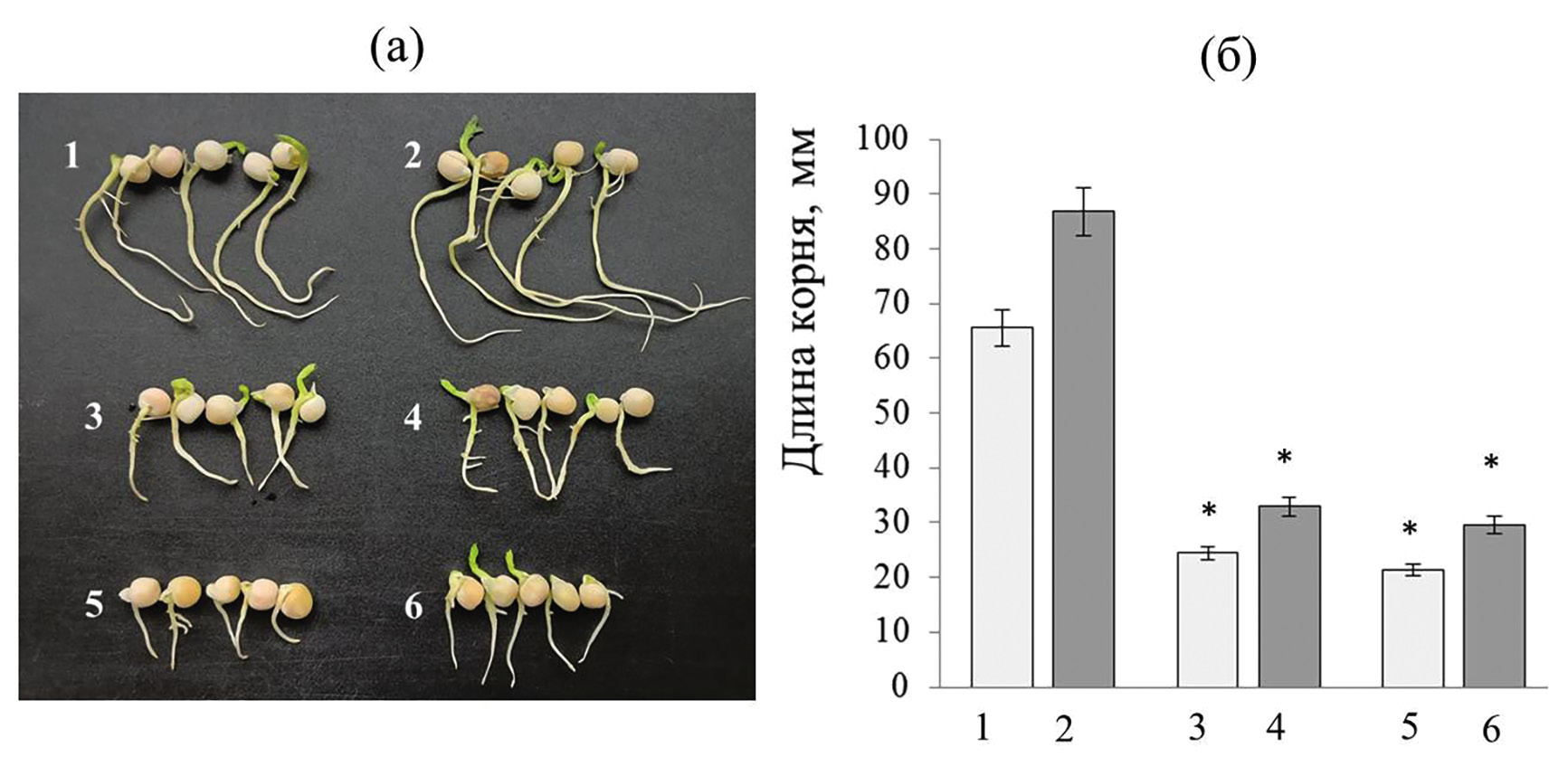 Рис. 5. Растения гороха (а) и длина корней проростков (б) при стрессовом воздействии Pb(CH3COO)2: 1 – необработанные семена; 2 – обработанные штаммом Pseudomonas sp. OBA 2.4.1 семена; 3 – необработанные семена в присутствии 1мМ Pb(CH3COO)2; 4 – обработанные псевдомонадами семена в присутствии 1 мМ Pb(CH3COO)2; 5 – необработанные семена в присутствии 2 мМ Pb(CH3COO)2; 6 – обработанные псевдомонадами семена в присутствии 2 мМ Pb(CH3COO)2.
